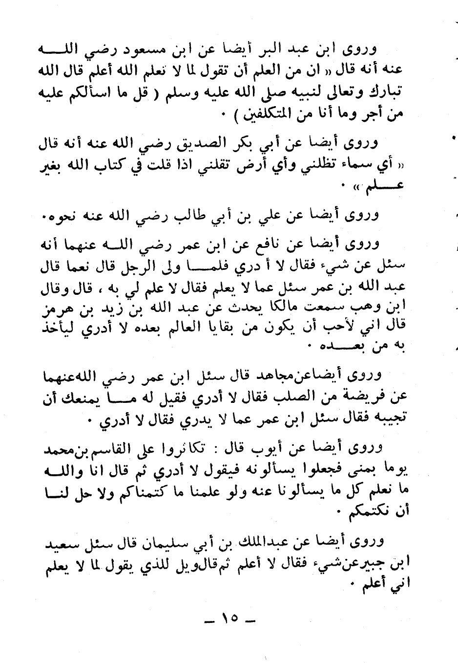 وروى ابن عبد البر أيضا عن ابن مسعود رضي الله عنه أنه قال: (إن من العلم أن تقول لما لا تعلم: الله أعلم, قال الله تبارك وتعالى لنبيه صلى الله عليه وسلم: «قل ما أسألكم عليه من أجر وما أنا من المتكلفين».