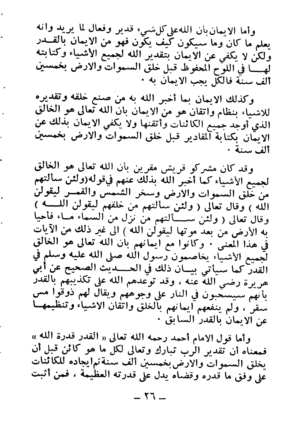 وأما الإيمان بأن الله على كل شيء قدير وفعال لما يريد وأنه يعلم ما كان وما سيكون كيف يكون؛ فهو من الإيمان بالقدر؛ ولكن لا يكفي عن الإيمان بتقدير الله لجميع الأشياء وكتابته لها في اللوح المحفوظ قبل خلق السموات والأرض بخمسين ألف سنة فالكل يجب الإيمان به.