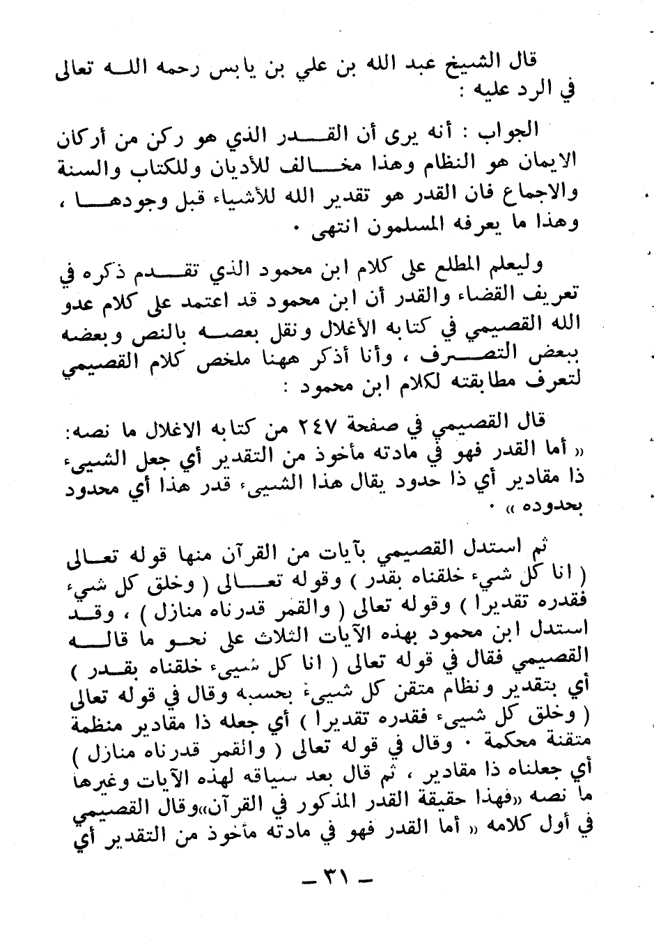 وليعلم المطلع على كلام ابن محمود الذي تقدم ذكره في تعريف القضاء والقدر أن ابن محمود قد اعتمد على كلام عدو الله القصيمي في كتابه الأغلال ونقل بعضه بالنص وبعضه ببعض التصرف، وأنا أذكر هاهنا ملخص كلام القصيمي لتعرف مطابقته لكلام ابن محمود:
