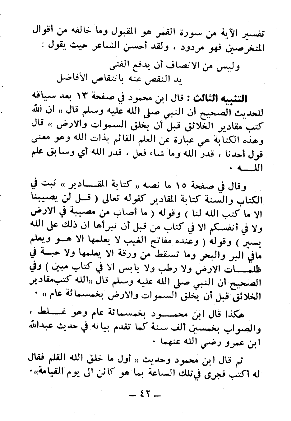 وقال في صفحة 15 ما نصه (كتابة المقادير) ثبت في الكتاب والسنة كتابه المقادير كقوله تعالى: {قُلْ لَنْ يُصِيبَنَا إِلَّا مَا كَتَبَ اللَّهُ لَنَا} وقوله: {مَا أَصَابَ مِنْ مُصِيبَةٍ فِي الْأَرْضِ وَلَا فِي أَنْفُسِكُمْ إِلَّا فِي كِتَابٍ مِنْ قَبْلِ أَنْ نَبْرَأَهَا إِنَّ ذَلِكَ عَلَى اللَّهِ يَسِيرٌ} وقوله: {وَعِنْدَهُ مَفَاتِحُ الْغَيْبِ لَا يَعْلَمُهَا إِلَّا هُوَ وَيَعْلَمُ مَا فِي الْبَرِّ وَالْبَحْرِ وَمَا تَسْقُطُ مِنْ وَرَقَةٍ إِلَّا يَعْلَمُهَا وَلَا حَبَّةٍ فِي ظُلُمَاتِ الْأَرْضِ وَلَا رَطْبٍ وَلَا يَابِسٍ إِلَّا فِي كِتَابٍ مُبِينٍ} وفي الصحيح أن النبي صلى الله عليه وسلم قال: «الله كتب مقادير الخلائق قبل أن يخلق السموات والأرض بخمسمائة عام».