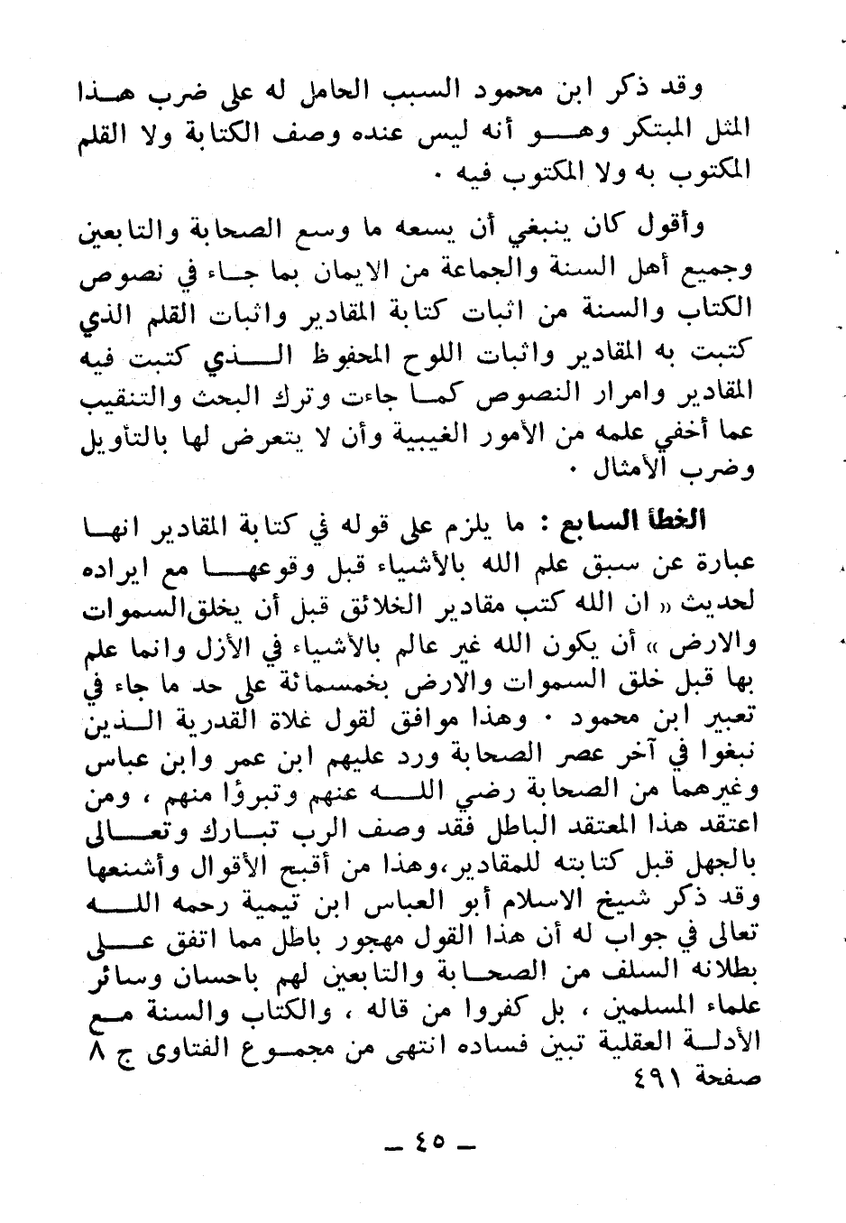 الخطأ السابع: ما يلزم على قوله في كتابة المقادير إنها عبارة عن سبق علم الله بالأشياء قبل وقوعها مع إيراده لحديث «إن الله كتب مقادير الخلائق قبل أن يخلق السموات والأرض» أن يكون الله غير عالم بالأشياء في الأزل وإنما علم بها قبل خلق السموات والأرض بخمسمائة على حد ما جاء في تعبير ابن محمود. وهذا موافق لقول غلاة القدرية الذين نبغوا في آخر عصر الصحابة ورد عليهم ابن عمر وابن عباس وغيرهما من الصحابة رضي الله عنهم وتبرؤا منهم، ومن اعتقد هذا المعتقد الباطل فقد وصف الرب تبارك وتعالى بالجهل قبل كتابته للمقادير، وهذا من أقبح الأقوال وأشنعها وقد ذكر شيخ الإسلام أبو العباس ابن تيمية رحمة الله تعالى في جواب له أن هذا القول مهجور باطل مما اتفق على بطلان السلف من الصحابة والتابعين لهم بإحسان وسائر علماء المسلمين، بل كفّروا من قاله، والكتاب والسنة مع الأدلة العقلية تبين فساده انتهى من مجموع الفتاوى ج 8 صفحة 491.