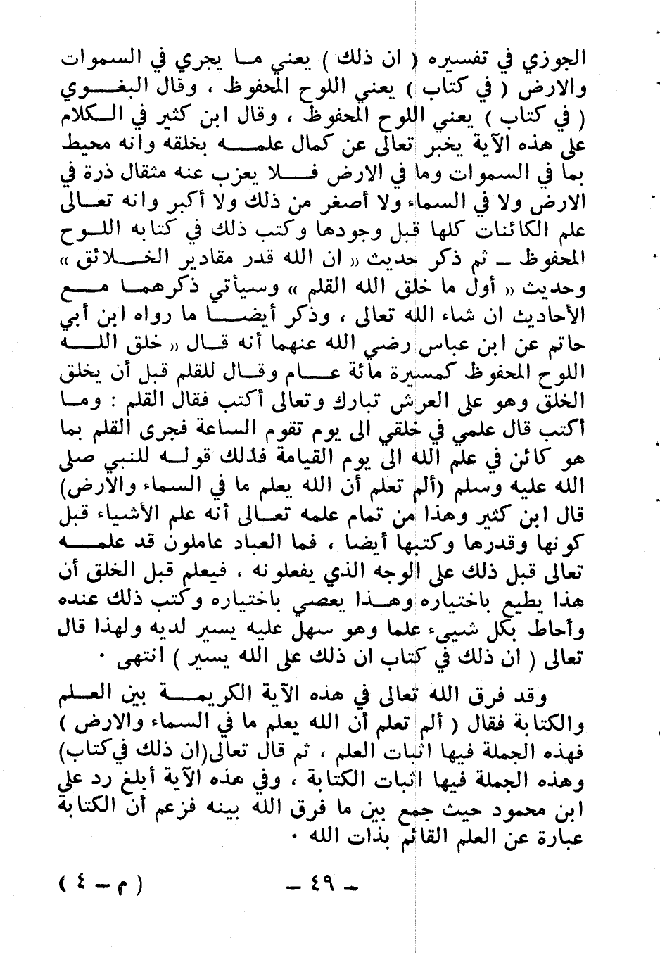 وقد فرق الله تعالى في هذه الآية الكريمة بين العلم والكتابة فقال: {أَلَمْ تَعْلَمْ أَنَّ اللَّهَ يَعْلَمُ مَا فِي السَّمَاءِ وَالْأَرْضِ} فهذه الجملة فيها إثبات العلم، ثم قال تعالى: {إِنَّ ذَلِكَ فِي كِتَابٍ} هذه الجملة فيها إثبات الكتابة، وفي هذه الآية أبلغ رد على ابن محمود حيث جمع بين ما فرق الله بينه فزعم أن الكتابة عبارة عن العلم القائم بذات الله.
