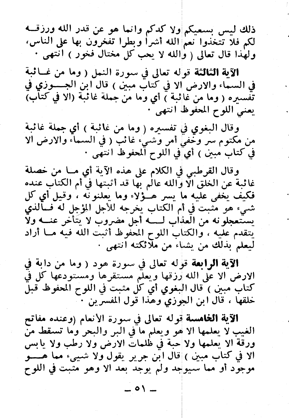 الآية الخامسة قوله تعالى في سورة الأنعام: {وَعِنْدَهُ مَفَاتِحُ الْغَيْبِ لَا يَعْلَمُهَا إِلَّا هُوَ وَيَعْلَمُ مَا فِي الْبَرِّ وَالْبَحْرِ وَمَا تَسْقُطُ مِنْ وَرَقَةٍ إِلَّا يَعْلَمُهَا وَلَا حَبَّةٍ فِي ظُلُمَاتِ الْأَرْضِ وَلَا رَطْبٍ وَلَا يَابِسٍ إِلَّا فِي كِتَابٍ مُبِينٍ} قال: ابن جرير يقول: ولا شيء مما هو موجود أو مما سيوجد ولم يوجد بعد إلا وهو مثبت في اللوح