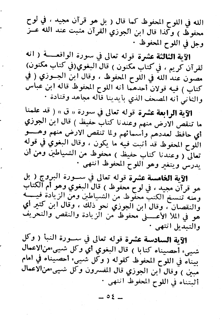 الآية الخامسة عشرة قولة تعالي في سورة البروج: {بَلْ هُوَ قُرْآَنٌ مَجِيدٌ * فِي لَوْحٍ مَحْفُوظٍ} قال البغوي: هو أم الكتاب ومنه تنسخ الكتب محفوظ من الشياطين ومن الزيادة فيه والنقصان، وقال ابن الجوزي نحو ذلك، وقال ابن كثير: أي هو في الملأ الأعلى محفوظ من الزيادة والنقص والتحريف والتبديل. انتهى.