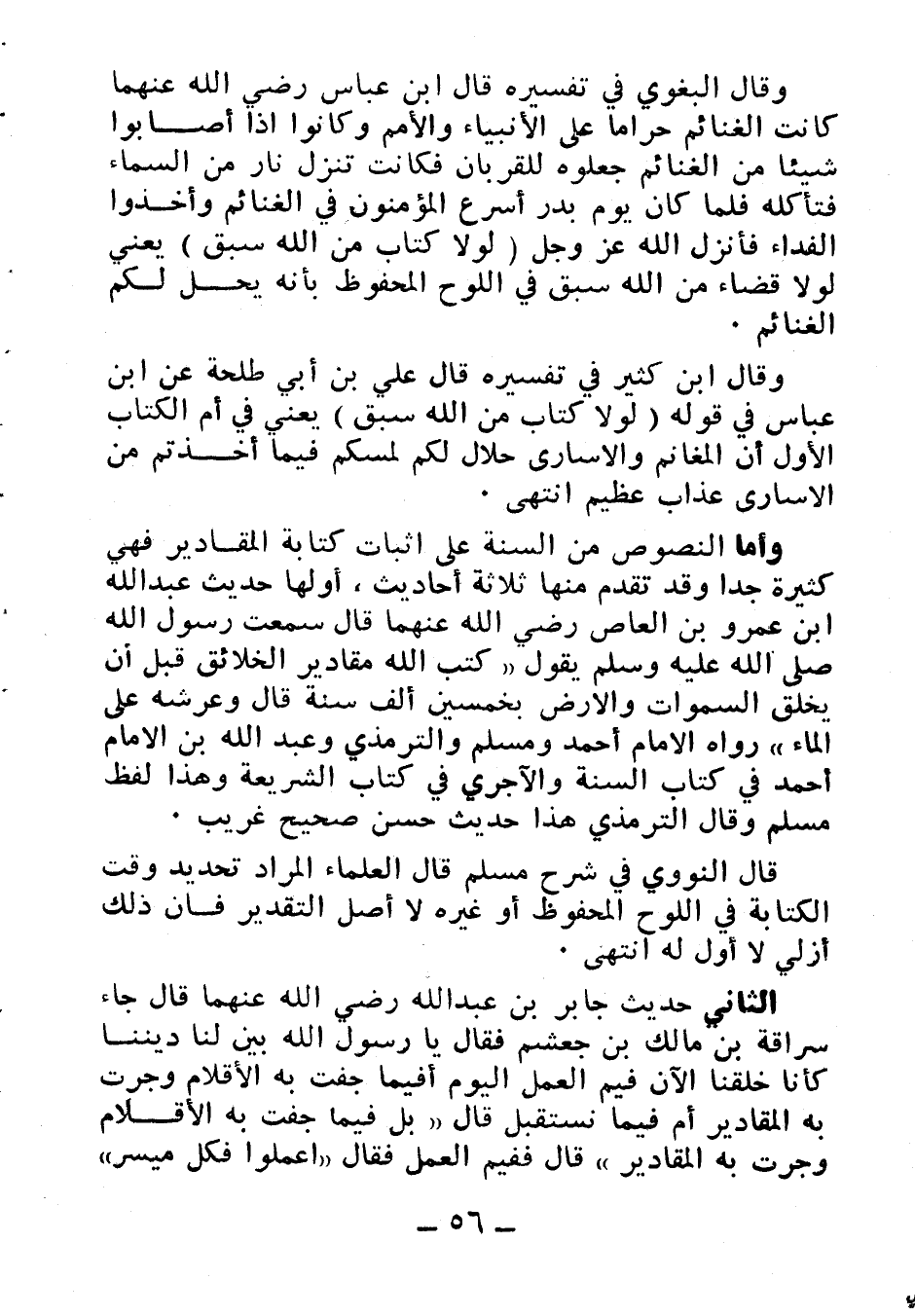 أما النصوص من السنة على إثبات كتابة المقادير فهي كثيرة جدا وقد تقدم منها ثلاثة أحاديث، أولها حديث عبد الله بن عمرو بن العاصي رضي الله عنهما قال: سمعت رسول الله صلى الله عليه وسلم يقول: «كتب الله مقادير الخلائق قبل أن يخلق السموات والأرض بخمسين ألف سنة قال: وعرشه على الماء» رواه الإمام أحمد ومسلم والترمذي وعبد الله بن الإمام أحمد في كتاب السنة والآجري في كتاب الشريعة وهذا لفظ مسلم وقال الترمذي: هذا حديث حسن صحيح غريب.