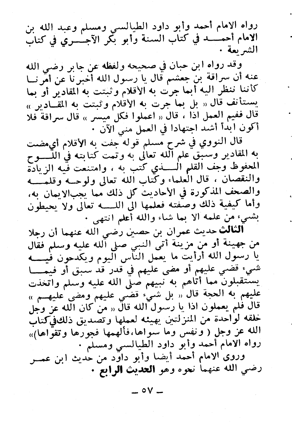 الثالث حديث عمران بن حصين رضي الله عنهما أن رجلا من جهينة أو من مزينة أتى النبي صلى الله عليه وسلم فقال: يا رسول الله أرأيت ما يعمل الناس اليوم ويكدحون فيه شيء قضى عليهم أو مضى عليهم في قدر قد سبق أو فيما يستقبلون مما أتاهم به نبيهم صلى الله عليه وسلم واتخذت عليهم به الحجة قال: «بل شيء قضى عليهم ومضى عليهم» قال: فلم يعملون إذا يا رسول الله؟ قال: «من كان الله عز وجل خلقه لواحدة من المنزلتين يهيئه لعملها وتصديق ذلك في كتاب الله عز وجل {وَنَفْسٍ وَمَا سَوَّاهَا * فَأَلْهَمَهَا فُجُورَهَا وَتَقْوَاهَا}» رواه الإمام أحمد وأبو داود الطيالسي ومسلم.