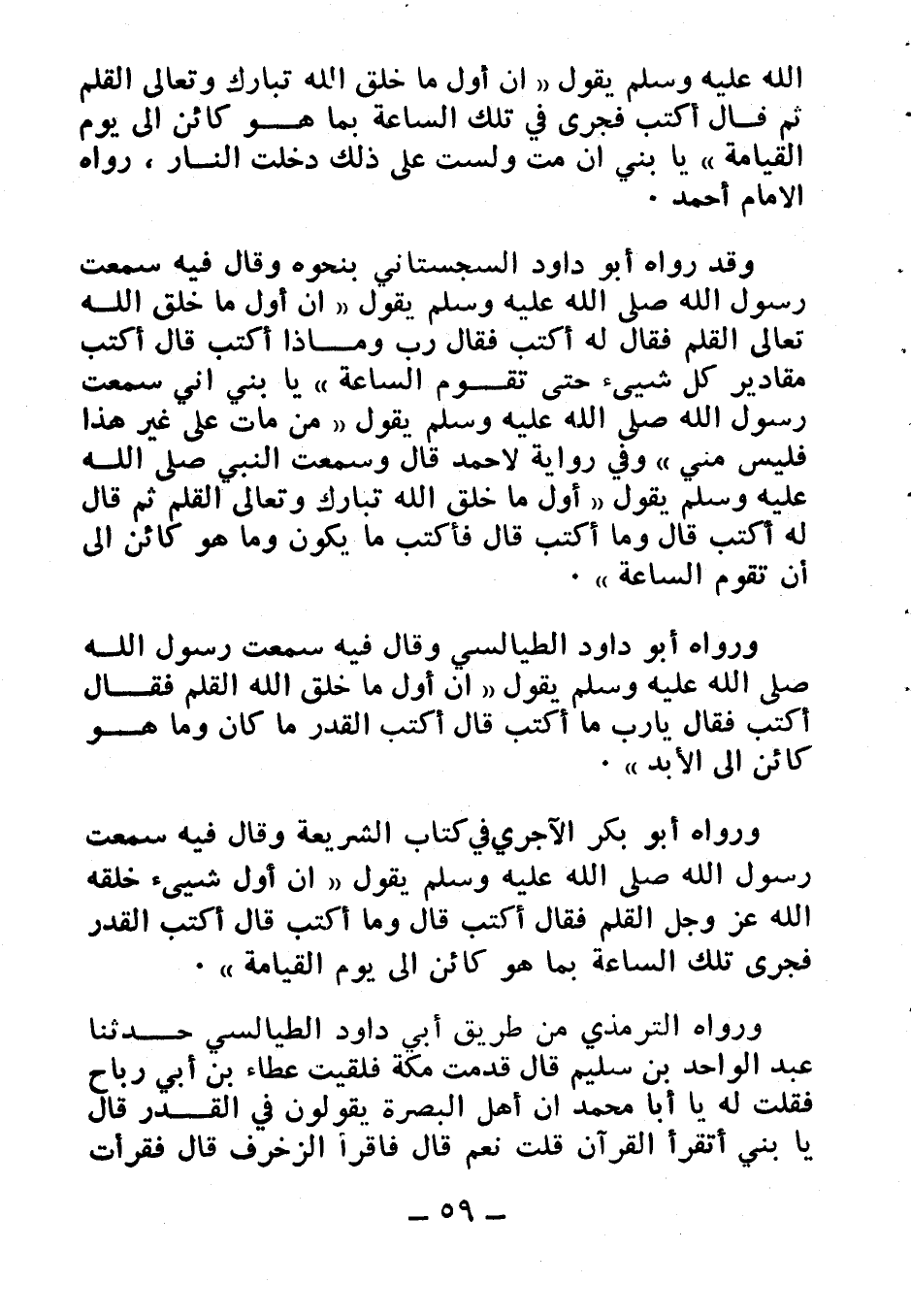 الله عليه وسلم يقول: «إن أول ما خلق الله تبارك وتعالى القلم ثم قال: اكتب فجرى في تلك الساعة بما هو كائن إلى يوم القيامة» يا بني؛ إن مت ولست على ذلك دخلت النار، رواه الإمام أحمد.