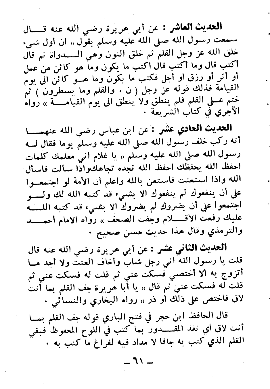 الحديث العاشر: عن أبي هريرة رضي الله عنه قال: سمعت رسول الله صلى الله عليه وسلم يقول: «إن أول شيء خلق الله عز وجل القلم، ثم خلق النون وهي الدواة، ثم قال: اكتب، قال: وما أكتب؟ قال: اكتب ما يكون وما هو كائن من عمل أو أثر أو رزق أو أجل فكتب ما يكون وما هو كائن إلى يوم القيامة، فذلك قوله عز وجل: {ن وَالْقَلَمِ وَمَا يَسْطُرُونَ}، ثم ختم على القلم فلم ينطق ولا ينطق إلى يوم القيامة» رواه الآجري في كتاب الشريعة.
