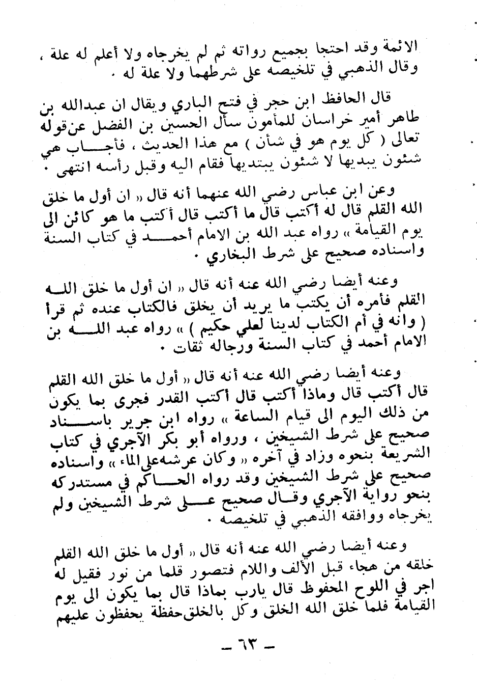 وعن أيضا رضي الله عنه أنه قال: «أول ما خلق الله القلم قال: اكتب, قال: وماذا أكتب؟ قال: اكتب القدر فجرى بما يكون من ذلك اليوم إلى قيام الساعة» رواه ابن جرير بإسناد صحيح على شرط الشيخين، ورواه أبو بكر الآجري في كتاب الشريعة بنحوه وزاد في آخره «وكان عرشه على الماء» وإسناده صحيح على شرط الشيخين وقد رواه الحاكم في مستدركه بنحو رواية الآجري وقال: صحيح على شرط الشيخين ولم يخرجاه ووافقه الذهبي في تلخيصه.