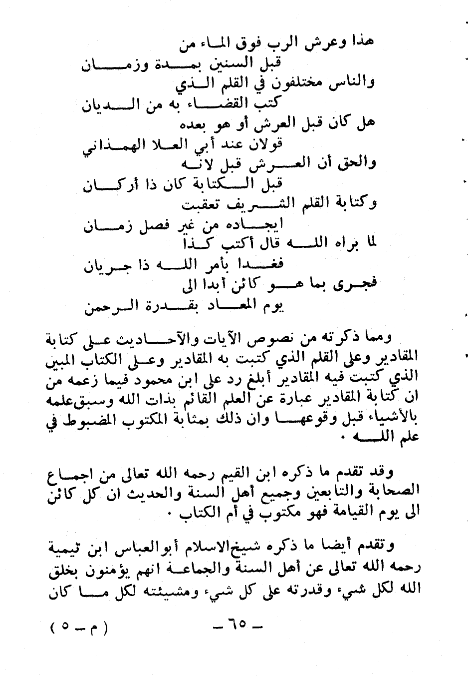 وتقدم أيضا ما ذكره شيخ الإسلام أبو العباس ابن تيمية رحمه الله تعالى عن أهل السنة والجماعة أنهم يؤمنون بخلق الله لكل شيء، وقدرته على كل شيء، ومشيئته لكل ما كان،