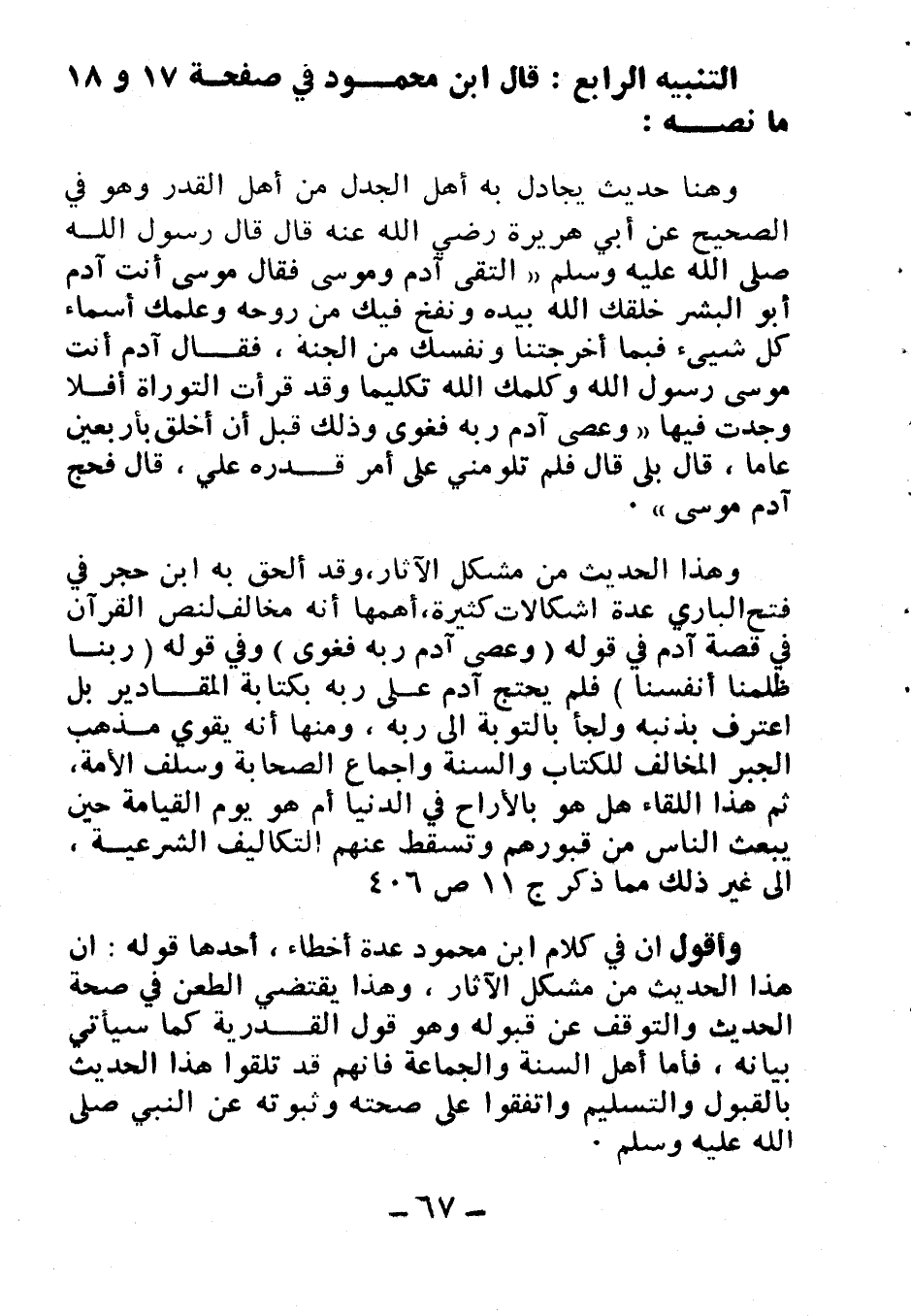 وأقول: إن في كلام ابن محمود عدة أخطاء، أحدها قوله: إن هذا الحديث من مشكل الآثار، وهذا يقتضي الطعن في صحة الحديث والتوقف عن قبوله وهو قول القدرية كما سيأتي بيانه، فأما أهل السنة والجماعة فإنهم قد تلقوا هذا الحديث بالقبول والتسليم واتفقوا على صحته وثبوته عن النبي صلى الله عليه وسلم.
