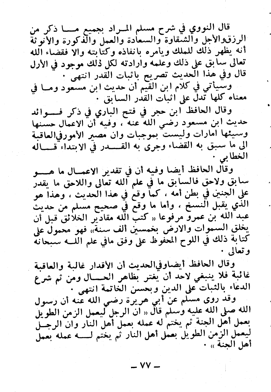 وقال الحافظ أيضا: وفيه أن في تقدير الأعمال ما هو سابق ولاحق فالسابق ما في علم الله تعالى واللاحق ما يقدر على الجنين في بطن أمه، كما وقع في هذا الحديث، وهذا هو الذي يقبل النسخ، وأما ما وقع في صحيح مسلم من حديث عبد الله بن عمرو مرفوعا «كتب الله مقادير الخلائق قبل أن يخلق السموات والأرض بخمسين ألف سنة» فهو محمول على كتابة ذلك في اللوح المحفوظ على وفق ما في علم الله سبحانه وتعالى.