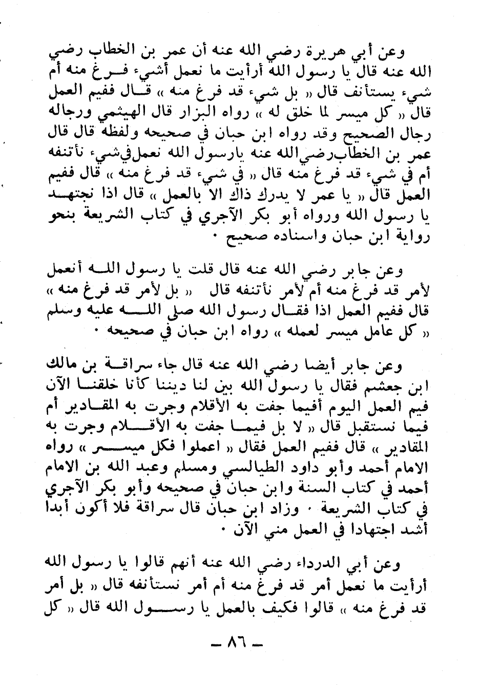 وعن جابر رضي الله عنه قال: قلت: يا رسول الله أنعمل لأمر قد فرغ منه أم لأمر نأتنفه قال: «بل لأمر قد فرغ منه» قال: ففيم العمل إذا؟ فقال رسول الله صلى الله عليه وسلم: «كل عامل ميسر لعمله» رواه ابن حبان في صحيحه.