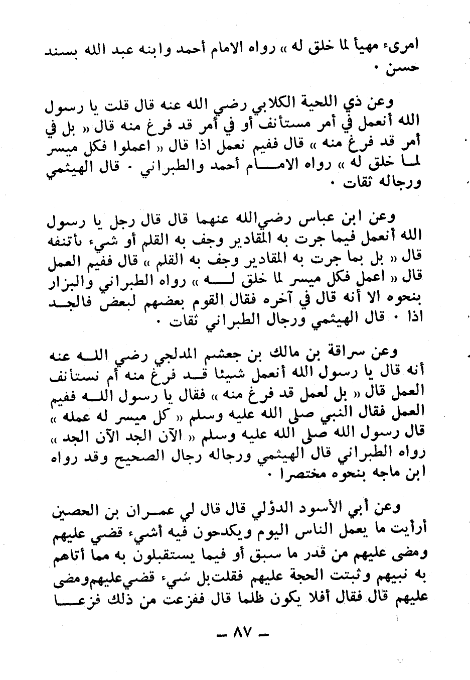 وعن ذي اللحية الكلابي رضي الله عنه قال: قلت: يا رسول الله أنعمل في أمر مستأنف أو في أمر قد فرغ منه؟ قال: «بل في أمر قد فرغ منه» قال: ففيم نعمل إذا؟ قال: «اعملوا فكل ميسر لما خلق له» رواه الإمام أحمد والطبراني. قال الهيثمي: ورجاله ثقات.