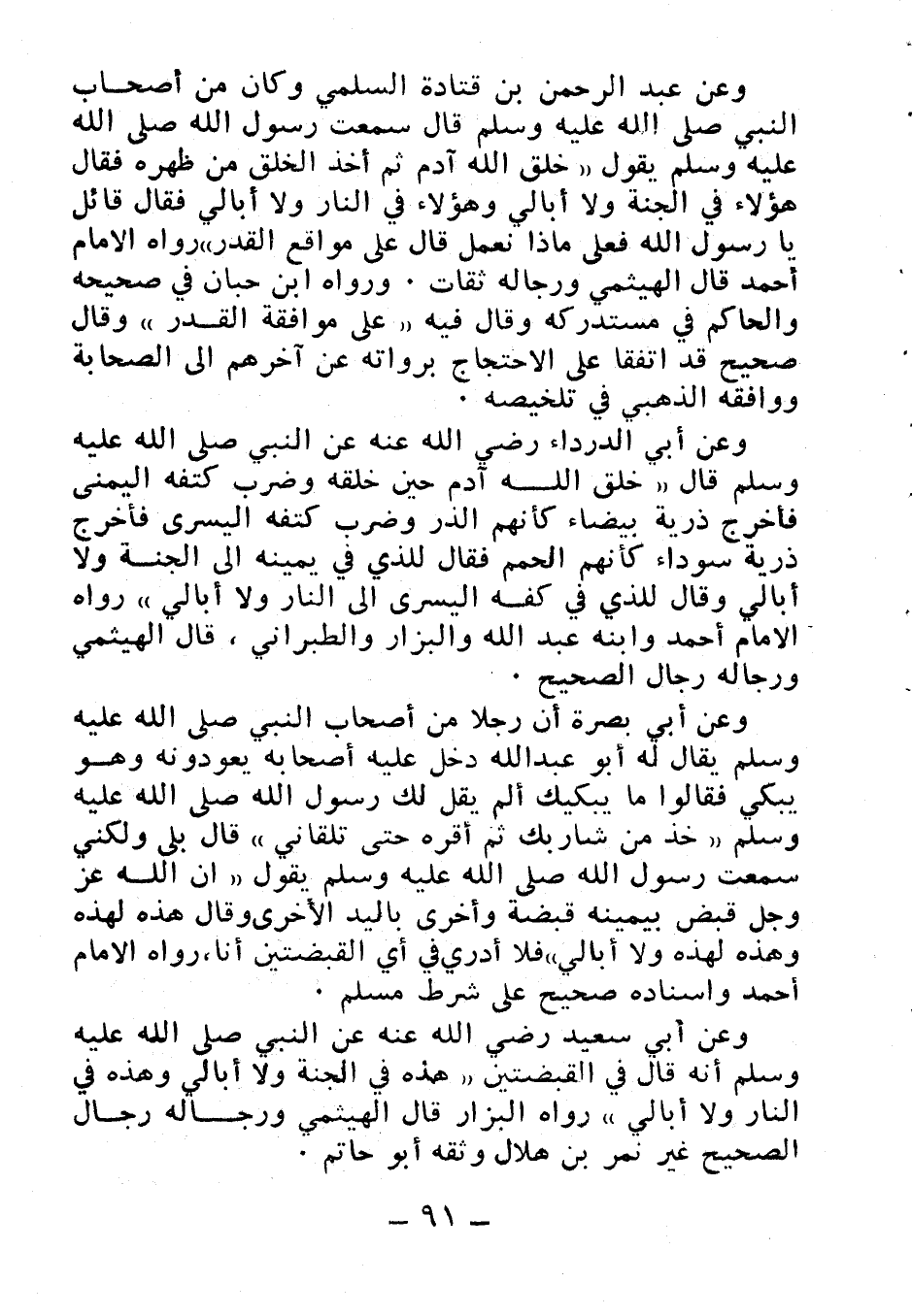 وعن عبد الرحمن بن قتادة السلمي وكان من أصحاب النبي صلى الله عليه وسلم قال: سمعت رسول الله صلى الله عليه وسلم يقول: «خلق الله آدم ثم أخذ الخلق من ظهره فقال: هؤلاء في الجنة ولا أبالي، وهؤلاء في النار ولا أبالي فقال قائل: يا رسول الله فعلى ماذا نعمل؟ قال: على مواقع القدر» رواه الإمام أحمد قال الهيثمي: ورجاله ثقات. ورواه ابن حبان في صحيح والحاكم في مستدركه وقال فيه «على موافقة القدر» وقال: صحيح قد اتفقا على الاحتجاج برواته عن آخرهم إلى الصحابة ووافقه الذهبي في تلخيصه.