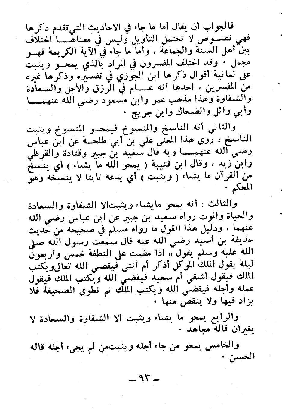فالجواب: أن يقال أما ما جاء في الأحاديث التي تقدم ذكرها فهي نصوص لا تحتمل التأويل وليس في معناها اختلاف بين أهل السنة والجماعة، وأما ما جاء في الآية الكريمة فهو مجمل. وقد اختلف المفسرون في المراد بالذي يمحو ويثبت على ثمانية أقوال ذكرها ابن الجوزي في تفسيره وذكرها غيره من المفسرين، أحدها أنه عام في الرزق والأجل والسعادة والشقاوة وهذا مذهب عمر وابن مسعود رضي الله عنهما وأبي وائل والضحاك وابن جريج.