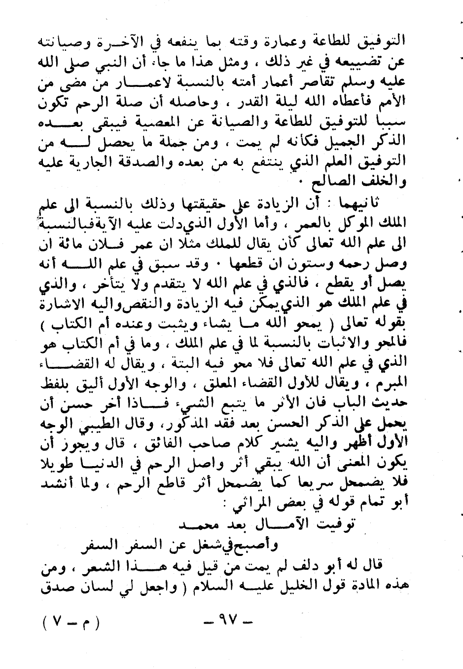 ثانيهما: أن الزيادة على حقيقتها وذلك بالنسبة إلى علم الملك الموكل بالعمر، وأما الأول الذي دلت عليه الآية فبالنسبة إلى علم الله تعالى كأن يقال للملك مثلا: إن عمر فلان مائة إن وصل رحمه وستون إن قطعها. وقد سبق في علم الله أنه يصل أو يقطع، فالذي في علم الله لا يتقدم ولا يتأخر، والذي في علم الملك هو الذي يمكن فيه الزيادة والنقص وإليه الإشارة بقوله تعالى: {يَمْحُوا اللَّهُ مَا يَشَاءُ وَيُثْبِتُ وَعِنْدَهُ أُمُّ الْكِتَابِ} فالمحو والإثبات بالنسبة لما في علم الملك، ويقال له القضاء المبرم، ويقال للأول القضاء المعلق، والوجه الأول أليق بلفظ حديث الباب فإن الأثر ما يتبع الشيء فإذا أخر حسن أن يحمل على الذكر الحسن بعد فقد المذكور، وقال الطيبي: الوجه الأول أظهر وإليه يشير كلام صاحب الفائق، قال: ويجوز أن يكون المعنى أن الله يبقى أثر واصل الرحم في الدنيا طويلا فلا يضمحل سريعا كما يضمحل أثر قاطع الرحم، ولما انشد أبو تمام قوله في بعض المراثي: