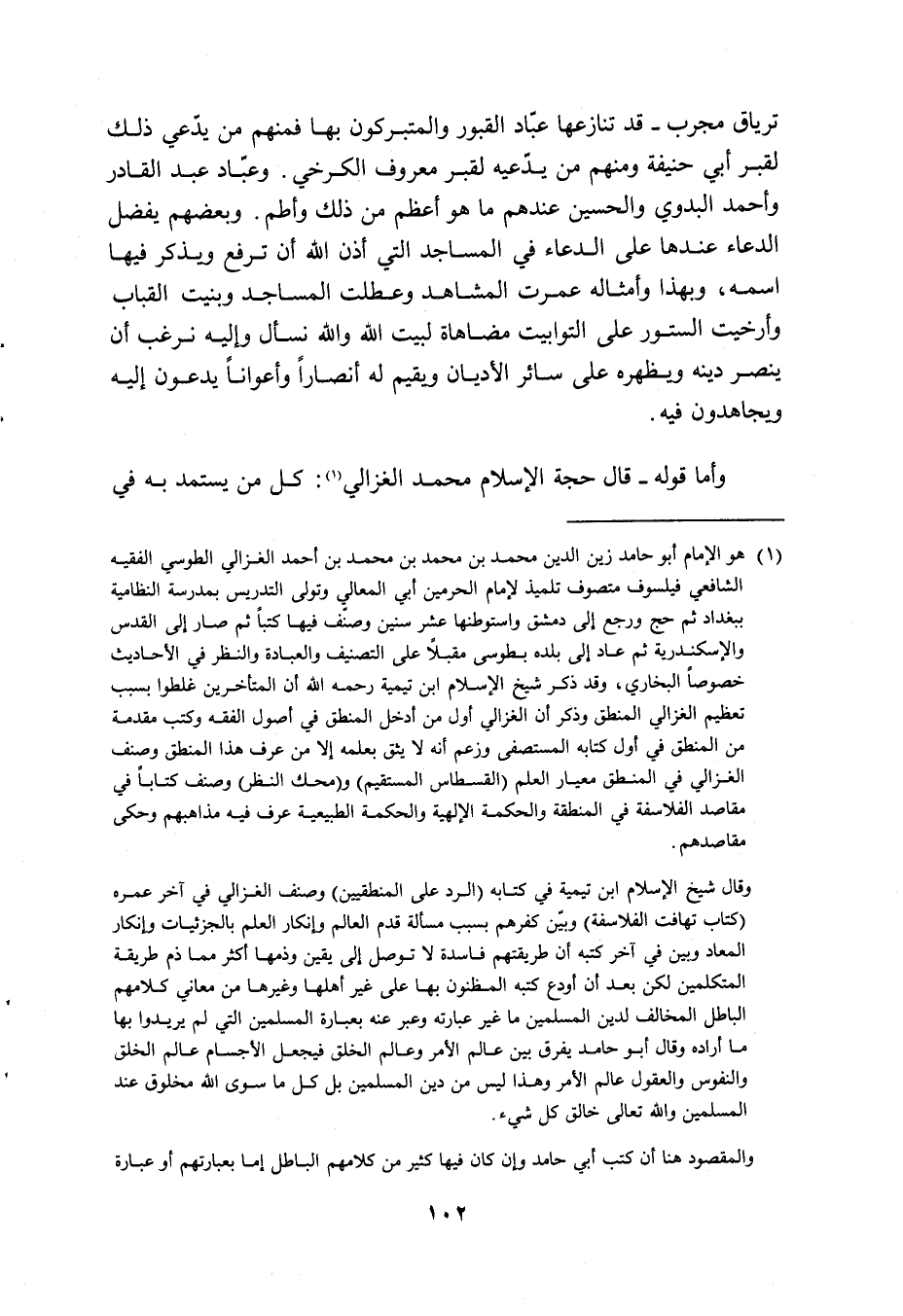 (1) هو الإمام أبو حامد زين الدين محمد بن محمد بن محمد بن أحمد الغزالي الطوسي الفقيه الشافعي فيلسوف متصوف تلميذ لإمام الحرمين أبي المعالي وتولى التدريس بمدرسة النظامية ببغداد ثم حج ورجع إلى دمشق واستوطنها عشر سنين وصنف فيها كتابا ثم صار إلى القدس والإسكندرية ثم عاد إلى بلده بطوسى مقبلا على التصنيف والعبادة والنظر في الأحاديث خصوصا البخاري وقد ذكر شيخ الإسلام ابن تيمية رحمه الله أن المتأخرين غلطوا بسبب تعظيم الغزالي المنطق وذكر أن الغزالي أول من أدخل المنطق في أصول الفقه وكتب مقدمة من المنطق في أول كتابه المستصفى وزعم أنه لا يثق بعلمه إلا من عرف هذا المنطق وصنف الغزالي في المنطق معيار العلم (القسطاس المستقيم) و (محك النظر) وصنف كتابا في مقاصد الفلاسفة في المنطق والحكمة الإلهية والحكمة الطبيعية عرف فيه مذاهبهم وحكى مقاصدهم.