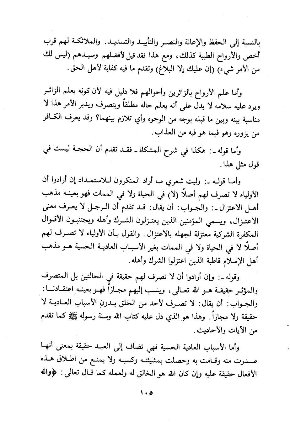 وقوله: وإن أرادوا أن لا تصرف لهم حقيقة في الحالتين بل المتصرف والمؤثر حقيقة هو الله تعالى، وينسب إليهم مجازا فهو بعينه اعتقادنا، والجواب أن يقال: لا تصرف لأحد من الخلق بدون الأسباب العادية لا حقيقة ولا مجازا، وهذا هو الذي دل عليه كتاب الله وسنة رسوله صلى الله عليه وسلم كما تقدم من الآيات والأحاديث.