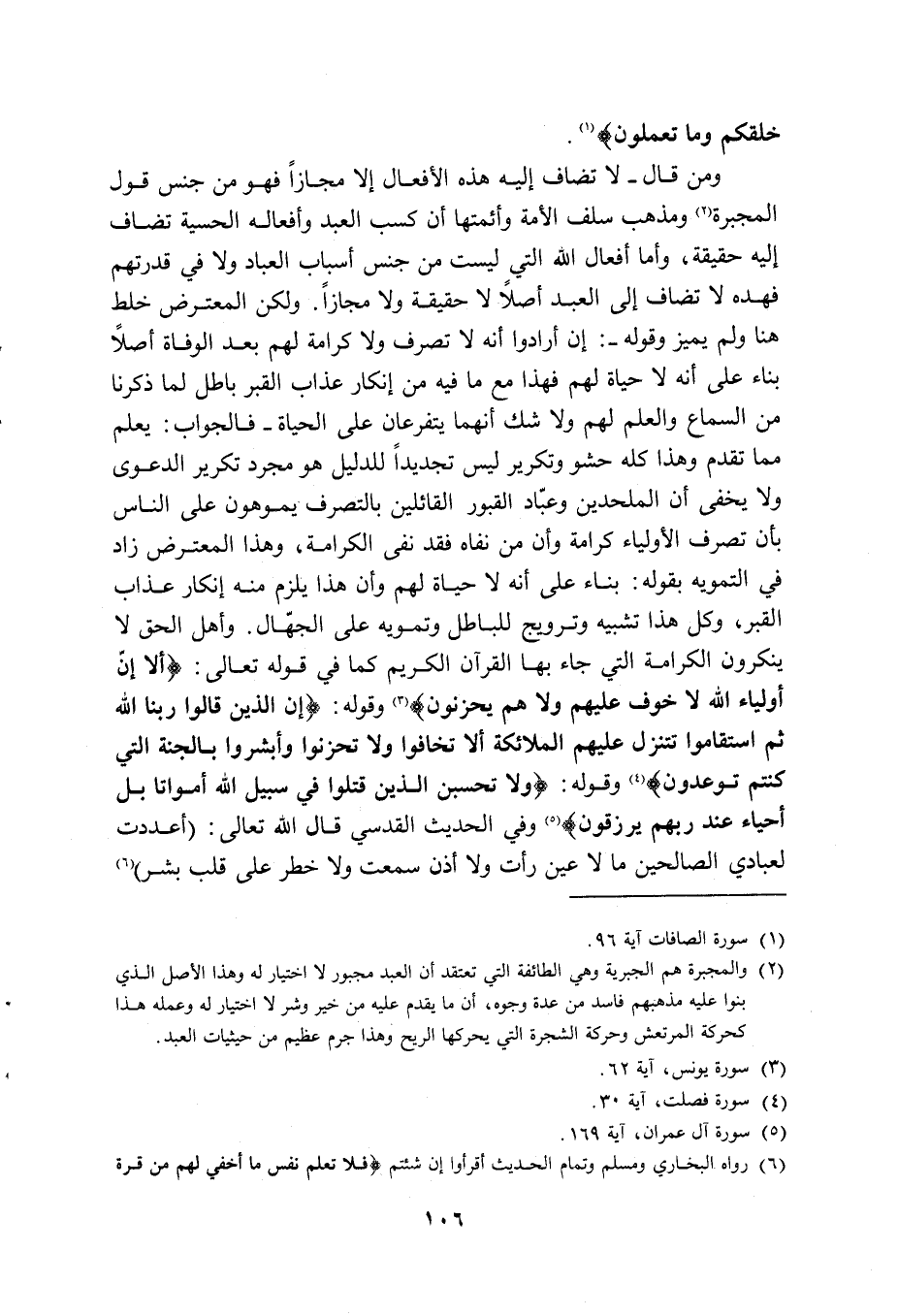 ومن قال: لا تضاف إليه هذه الأفعال إلا مجازا فهو من جنس قول المجبرة (2) ومذهب سلف الأمة وأئمتها أن كسب العبد وأفعاله الحسية تضاف إليه حقيقة، وأما أفعال الله التي ليست من جنس أسباب العباد ولا في قدرتهم فهذه لا تضاف إلى العبد أصلا لا حقيقة ولا مجازا. ولكن المعترض خلط هنا ولم يميز وقوله: إن أرادوا أنه لا تصرف ولا كرامة لهم بعد الوفاة أصلا بناء على أنه لا حياة لهم فهذا مع ما فيه من إنكار عذاب القبر باطل لما ذكرناه من السماع والعلم لهم ولا شك أنهما يتفرعان على الحياة، فالجواب: يعلم مما تقدم وهذا كله حشو وتكرير ليس تجديا للدليل هو مجرد تكرير الدعوى ولا يخفى أن الملحدين وعباد القبور القائلين بالتصرف يموهون على الناس بأن تصرف الأولياء كرامة وأن من نفاه فقد نفى الكرامة، وهذا المعترض زاد في التمويه بقوله: بناء على أنه لا حياة لهم وأن هذا يلزم منه إنكار عذاب القبر، وكل هذا تشبيه وترويج للباطل وتمويه على الجهال. وأهل الحق لا ينكرون الكرامة التي جاء بها القرآن الكريم كما في قوله تعالى: {أَلا إِنَّ أَوْلِيَاءَ اللَّهِ لا خَوْفٌ عَلَيْهِمْ وَلا هُمْ يَحْزَنُونَ} (3) وقوله: {إِنَّ الَّذِينَ قَالُوا رَبُّنَا اللَّهُ ثُمَّ اسْتَقَامُوا تَتَنَزَّلُ عَلَيْهِمُ الْمَلائِكَةُ أَلَّا تَخَافُوا وَلا تَحْزَنُوا وَأَبْشِرُوا بِالْجَنَّةِ الَّتِي كُنْتُمْ تُوعَدُونَ} (4) وقوله: {وَلا تَحْسَبَنَّ الَّذِينَ قُتِلُوا فِي سَبِيلِ اللَّهِ أَمْوَاتاً بَلْ أَحْيَاءٌ عِنْدَ رَبِّهِمْ يُرْزَقُونَ} (5) وفي الحديث القدسي قال الله تعالى: "أعددت لعبادي الصالحين ما لا عين رأت ولا أذن سمعت ولا خطر على قلب بشر" (6)