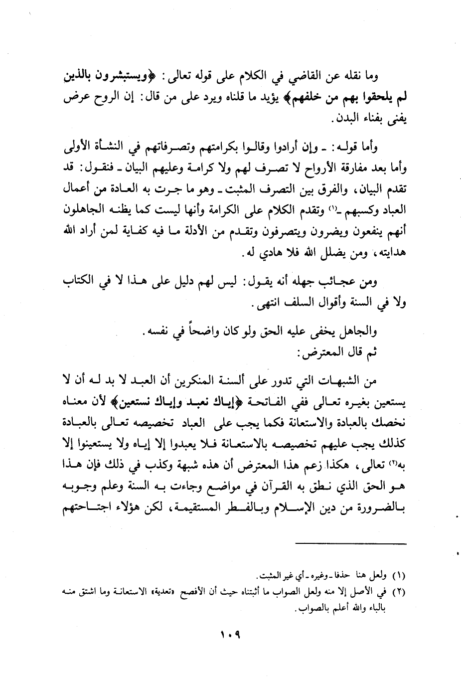 ثم قال المعترض: من الشبهات التي تدور على ألسنة المنكرين أن العبد لابد له أن لا يستعين بغيره تعالى ففي الفاتحة {إِيَّاكَ نَعْبُدُ وَإِيَّاكَ نَسْتَعِينُ} لأن معناها نخصك بالعبادة والاستعانة فكما يجب على العباد تخصيصه تعالى بالعبادة كذلك يجب عليهم تخصيصه بالاستعانة فلا يعبدوا إلا إياه ولا يستعينوا إلا به (2) تعالى، هكذا زعم هذا المعترض أن هذه شبهة وكذب في ذلك فإن هذا هو الحق الذي نطق به القرآن في مواضع وجاءت به السنة وعلم وجوبه بالضرورة من دين الإسلام وبالفطر المستقيمة، لكن هؤلاء اجتاحتهم