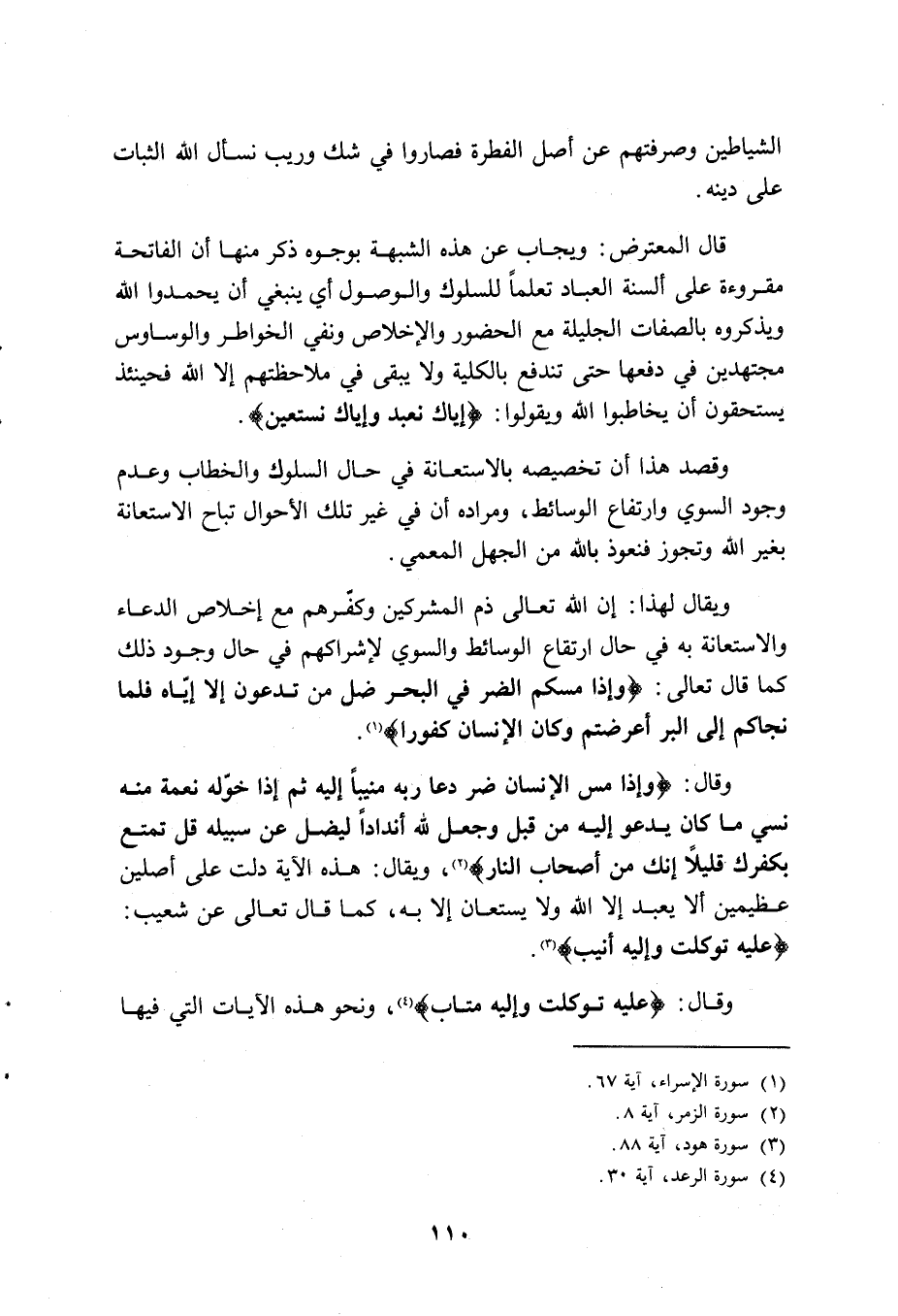 ويقال لهذا: إن الله تعالى ذم المشركين وكفرهم مع إخلاص الدعاء والاستعانة به في حال ارتقاع الوسائط والسوي لإشراكهم في حال وجود ذلك كما قال تعالى: {وَإِذَا مَسَّكُمُ الضُّرُّ فِي الْبَحْرِ ضَلَّ مَنْ تَدْعُونَ إِلَّا إِيَّاهُ فَلَمَّا نَجَّاكُمْ إِلَى الْبَرِّ أَعْرَضْتُمْ وَكَانَ الْأِنْسَانُ كَفُوراً} (2) وقال: {وَإِذَا مَسَّ الْأِنْسَانَ ضُرٌّ دَعَا رَبَّهُ مُنِيباً إِلَيْهِ ثُمَّ إِذَا خَوَّلَهُ نِعْمَةً مِنْهُ نَسِيَ مَا كَانَ يَدْعُو إِلَيْهِ مِنْ قَبْلُ وَجَعَلَ لِلَّهِ أَنْدَاداً لِيُضِلَّ عَنْ سَبِيلِهِ قُلْ تَمَتَّعْ بِكُفْرِكَ قَلِيلاً إِنَّكَ مِنْ أَصْحَابِ النَّارِ} (3) ، ويقال هذه الآية دلت على أصلين عظيمين ألا يعبد إلا الله ولا يستعان إلا به، كما قال تعالى عن شعيب: {ِ عَلَيْهِ تَوَكَّلْتُ وَإِلَيْهِ أُنِيبُ} (4) وقال: {عَلَيْهِ تَوَكَّلْتُ وَإِلَيْهِ مَتَابِ} (5) ، ونحو هذه الآيات التي فيها