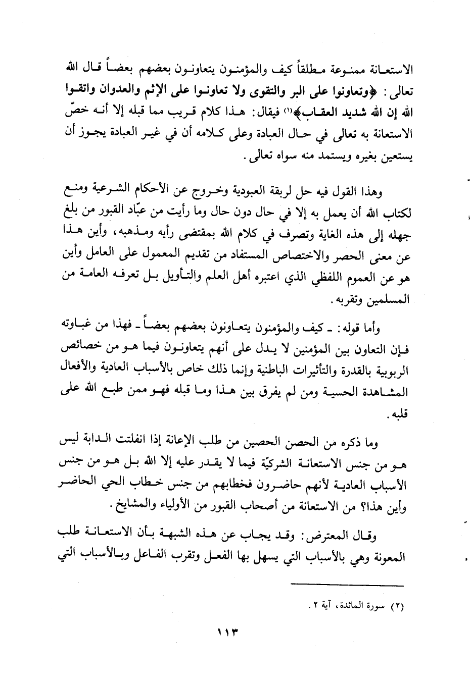 الاستعانة ممنوعة مطلقا كيف والمؤمنون يتعاونون بعضهم بعضا قال الله تعالى: {وَتَعَاوَنُوا عَلَى الْبِرِّ وَالتَّقْوَى وَلا تَعَاوَنُوا عَلَى الْأِثْمِ وَالْعُدْوَانِ وَاتَّقُوا اللَّهَ إِنَّ اللَّهَ شَدِيدُ الْعِقَابِ} (1) فيقال: هذا كلام قريب مما قبله إلا أنه خص الاستعانة به تعالى في حال العبادة وعلى كلامه أن في غير العبادة يجوز أن يستعين بغيره ويستمد منه سواه تعالى.