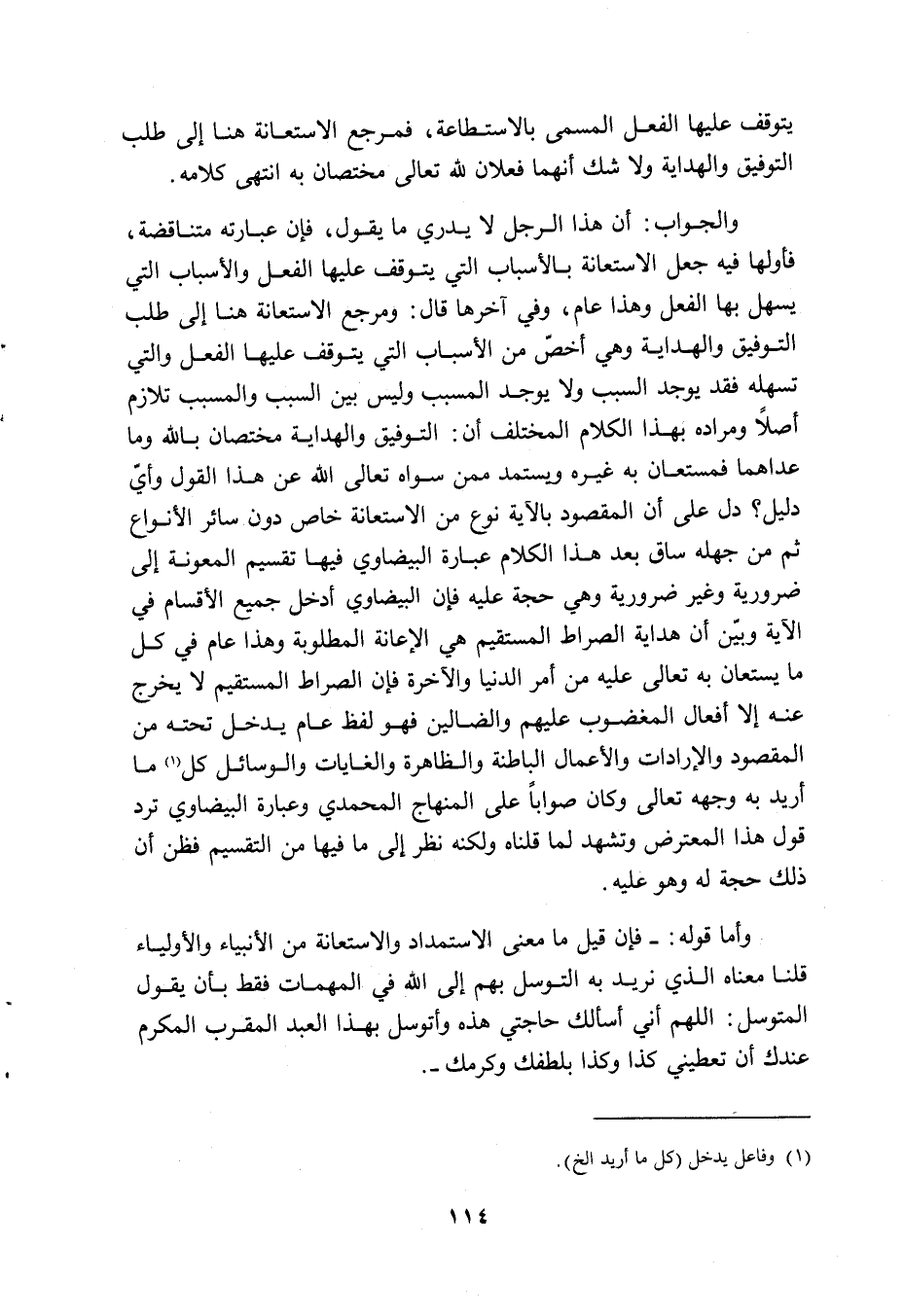 والجواب: أن هذا الرجل لا يدري ما يقول، فإن عبارته متناقضة، فأولها فيه جعل الاستعانة بالأسباب التي يتوقف عليها الفعل والأسباب التي يسهل الفعل وهذا عام، وفي آخرها قال: ومرجع الاستعانة هنا إلى طلب التوفيق والهداية وهي أخص من الأسباب التي يتوقف عليها الفعل والتي تسهله فقد يوجد السبب ولا يوجد المسبب وليس بين السبب والمسبب تلازم أصلا ومراده بهذا الكلام المختلف أن: التوفيق والهداية مختصان بالله وما عداهما فمستعان به غيره ويستمد ممن سواه تعالى الله عن هذا القول وأي دليل؟ دل على أن المقصود بالآية نوع من الاستعانة خاص دون سائر الأنواع ثم من جهله ساق بعد هذا الكلام عبارة البيضاوي فيها تقسيم المعونة إلى ضرورية وغير ضرورية وهي حجة عليه فإن البيضاوي أدخل جميع الأقسام في الآية وبين أن هداية الصراط المستقيم هي الإعانة المطلوبة وهذا عام في كل ما يستعان به تعالى عليه من أمر الدنيا والآخرة فإن الصراط المستقيم لا يخرج عنه إلا أفعال المغضوب عليهم والضالين فهو لفظ عام يدخل تحته من المقصود والإرادات والأعمال الباطنة والظاهرة والغايات والوسائل كل (1) ما أريد به وجهه تعالى وكان صوابا على المنهاج المحمدي وعبارة البيضاوي ترد قول هذا المعترض وتشهد لما قلناه ولكنه نظر إلى ما فيه من التقسيم فظن أن ذلك حجة له وهو عليه.