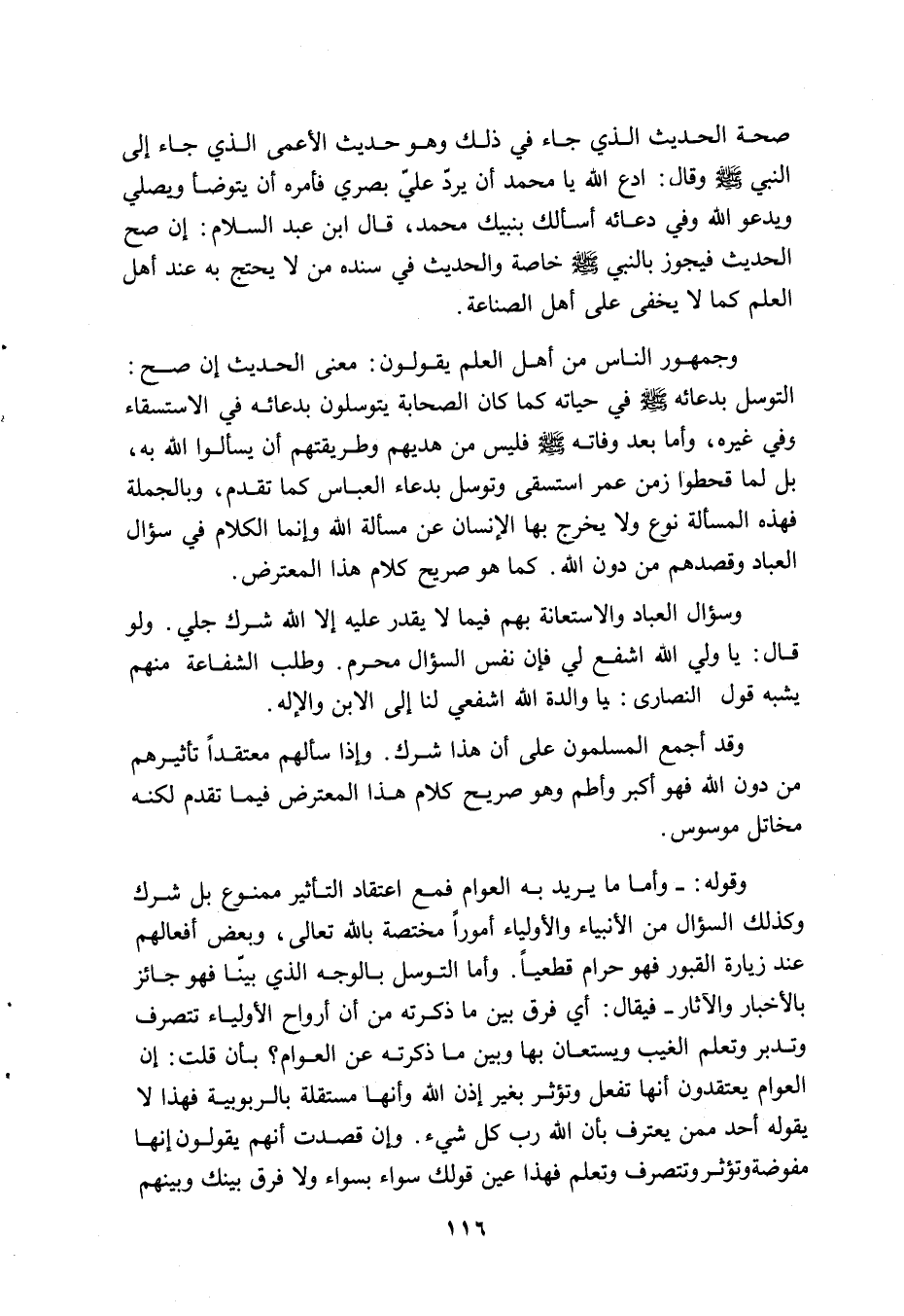 وقوله: وأما ما يريد به العوام فمع اعتقاد التأثير ممنوع بل شرك وكذلك السؤال من الأنبياء والأولياء أمورا مختصة بالله تعالى، وبعض أفعالهم عند زيارة القبور فهو حرام قطعيا. وأما التوسل بالوجه الذي بينً فهو جائز بالأخبار والآثار فيقال: أي فرق بين ما ذكرته من أن أرواح الأولياء تتصرف وتدبر وتعلم الغيب ويستعان بها وبين ما ذكرته عن العوام؟ بأن قلت: إن العوام يعتقدون أنها تفعل وتؤثر بغير إذن الله وأنها مستقلة بالربوبية فهذا لا يقوله أحد ممن يعترف بأن الله رب كل شيء. وإن قصدت أنه يقولون إنها مفوضة وتأثر وتتصرف وتعلم فهذا عين قولك سواء بسواء ولا فرق بينك وبينهم.