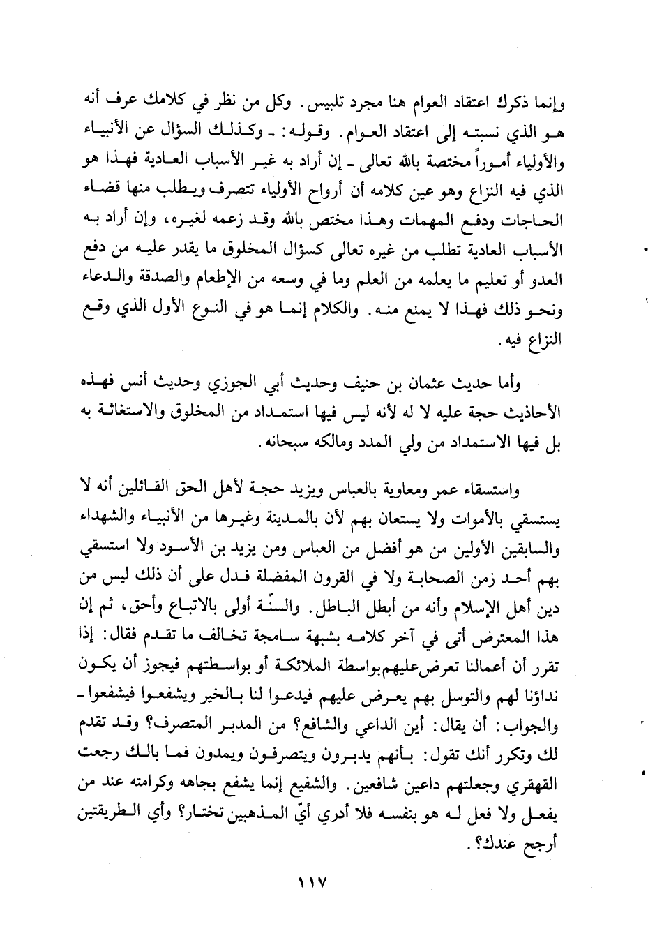 وإنما ذكرك اعتقاد العوام هنا مجرد تلبيس، وكل من نظر في كلامك عرف أنه هو الذي نسبته إلى اعتقاد العوام وقوله: وكذلك السؤال عن الأنبياء والأولياء أمورا مختصة بالله تعالى إن أراد به غير الأسباب العادية فهذا هو الذي فيه النزاع وهو عين كلامه أن أرواح الأولياء تتصرف ويطلب منها قضاء الحاجات ودفع المهمات وهذا مختص بالله وقد زعمه لغيره، وإن أراد به الأسباب العادية تطلب من غيره تعالى كسؤال المخلوق ما يقدر عليه من دفع العدو أو تعليم ما يعلمه من العلم وما في وسعه من الإطعام والصدقة والدعاء ونحو ذلك فهذا لا يمنع منه، والكلام إنما هو في النوع الأول الذي وقع النزاع فيه.