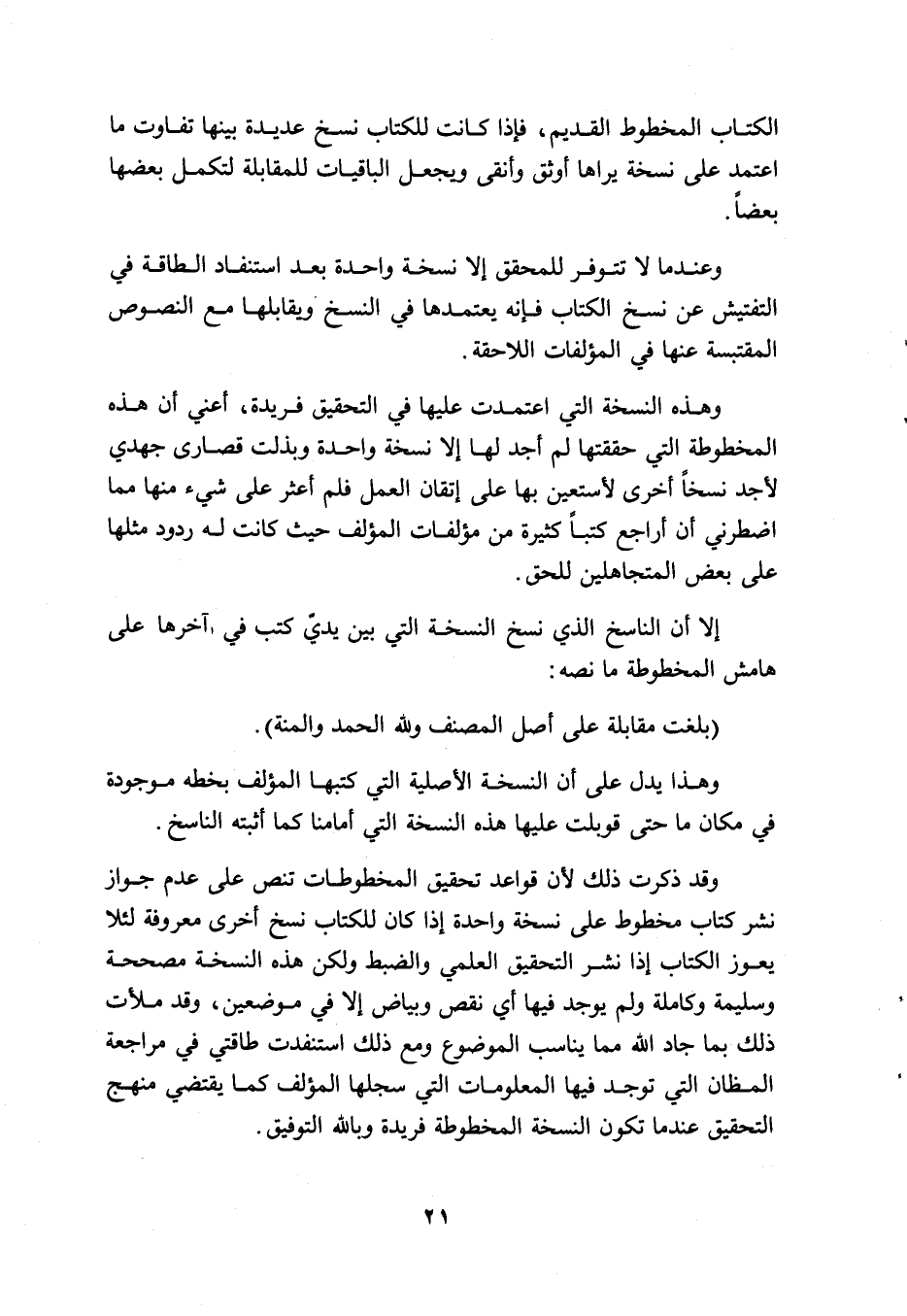 وقد ذكرت ذلك لأن قواعد تحقيق المخطوطات تنص على عدم جواز نشر كتاب مخطوط على نسخة واحدة إذا كان للكتاب نسخ أخرى معروفة لئلا يعوز الكتاب إذا نشر التحقيق العلمي والضبط ولكن هذه النسخة مصححة وسليمة وكاملة ولم يوجد فيها أي نقص وبياض إلا في موضعين، وقد ملأت ذلك بما جاد الله مما يناسب الموضوع ومع ذلك استنفدت طاقتي في مراجعة المظان التي توجد فيها المعلومات التي سجلها المؤلف كما يقتضي منهج التحقيق عندما تكون النسخة المخطوطة فريدة وبالله التوفيق.