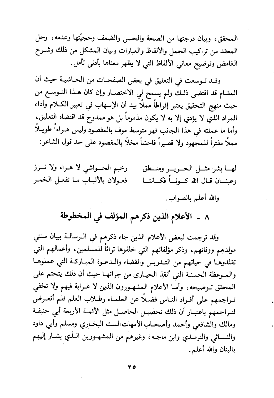 وقد توسعت في التعليق في بعض الصفحات من الحاشية حيث أن المقام قد اقتضى ذلك ولم يسمح لي الاختصار وإن كان هذا التوسع من حيث منهج التحقيق يعتبر إفراطا مملا بيد أن الإسهاب في تعبير الكلام وأداء المراد الذي لا يؤدي إلا به لا يكون مذموما بل هو ممدوح قد اقتضاه التعليق، وأما ما عملته في هذا الجانب فهو متوسط موف بالمقصود على حد قول الشاعر: