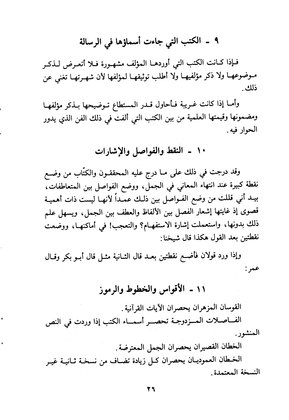 وقد درجت في ذلك على ما درج عليه المحققون والكتاب من وضع نقطة كبيرة عند انتهاء المعاني في الجمل، ووضع الفواصل بين المتعاطفات، بيد أني قللت من وضع الفواصل بين ذلك عمدا لأنها ليست ذات أهمية قصوى إذ غايتها إشعار الفصل بين الألفاظ والعطف بين الجمل، ويسهل علم ذلك بدونها، واستعملت إشارة الاستفهام؟ والتعجب! في أماكنها، ووضعت نقطتين بعد القول هكذا قال شيخنا: