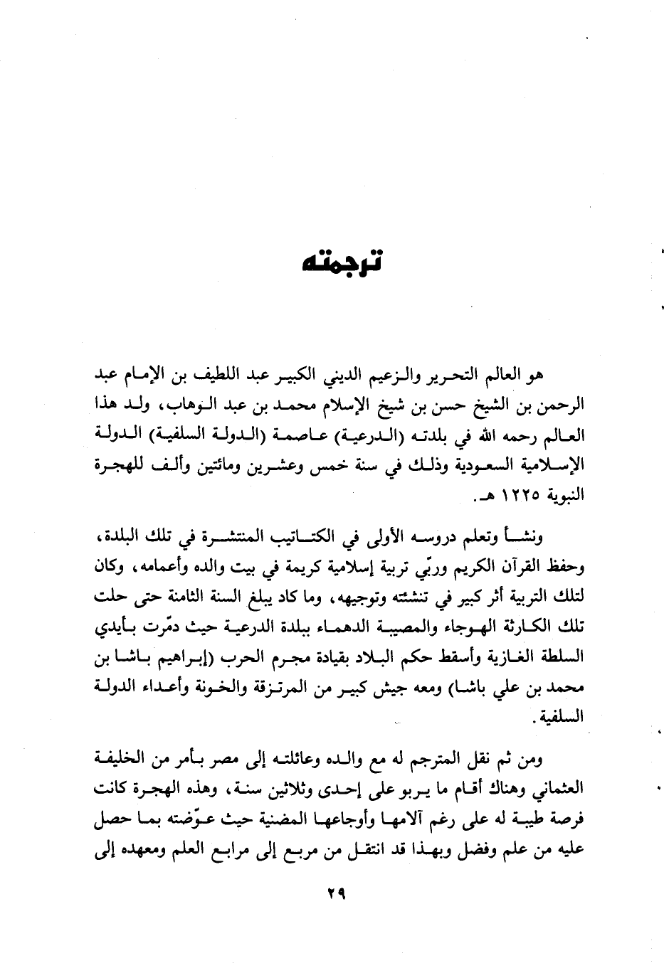 هو العالم النحرير والزعيم الديني الكبير عبد اللطيف بن الإمام عبد الرحمن بن الشيخ حسن بن شيخ الإسلام محمد بن عبد الوهاب، ولد هذا العالم رحمه الله في بلدته (الدرعية) عاصمة (الدولة السلفية) الدولة الإسلامية السعودية وذلك في سنة خمس وعشرين ومائتين وألف للهجرة النبوية 1225هـ.