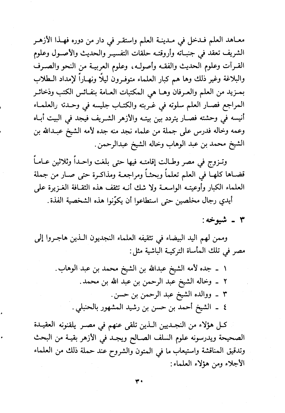كل هؤلاء من النجديين الذين تلقى عنهم في مصر يلقنونه العقيدة الصحيحة ويدرسونه علوم السلف الصالح ويجد في الأزهر بقية من البحث وتدقيق المناقشة واستيعاب ما في المتون والشروح عند حملة ذلك من العلماء الأجلاء ومن هؤلاء العلماء: