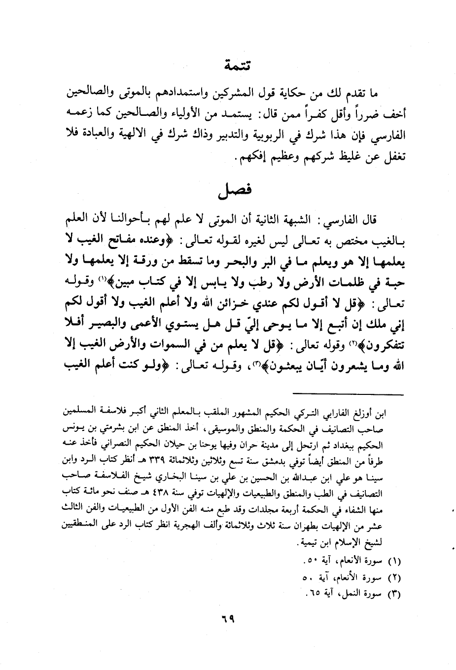 =بن أوزلغ التركي الحكيم المشهور الملقب بالمعلم الثاني أكبر فلاسفة المسلمين صاحب التصانيف في الحكمة والمنطق والموسيقى، أخذ المنطق عن ابن بشرمتي بن يونس الحكيم ببغداد ثم ارتحل إلى مدينة حران وفيها يوحنا بن حيلان الحكيم النصراني فأخذ عنه طرفا من المنطق أيضا توفي بدمشق سنة تسع وثلاثين وثلاثمائة 339 هـ أنظر كتاب الرد وابن سينا هو على ابن عبد الله بن الحسين بن على بن سينا البخاري شيخ الفلاسفة صاحب التصانيف في الطب والمنطق والطبيعيات والإلهيات توفي سنة 438هـ صنف نحو مائة كتاب منها الشفاء في الحكمة أربع مجلدات وقد طبع منه الفن الأول من الطبيعيات والفن الثالث عشر من الإلهيات بطهران سنة ثلث وثلاثمائة وألف الهجرية انظر كتاب الرد على المنطقيين لشيخ الإسلام ابن تيمية.