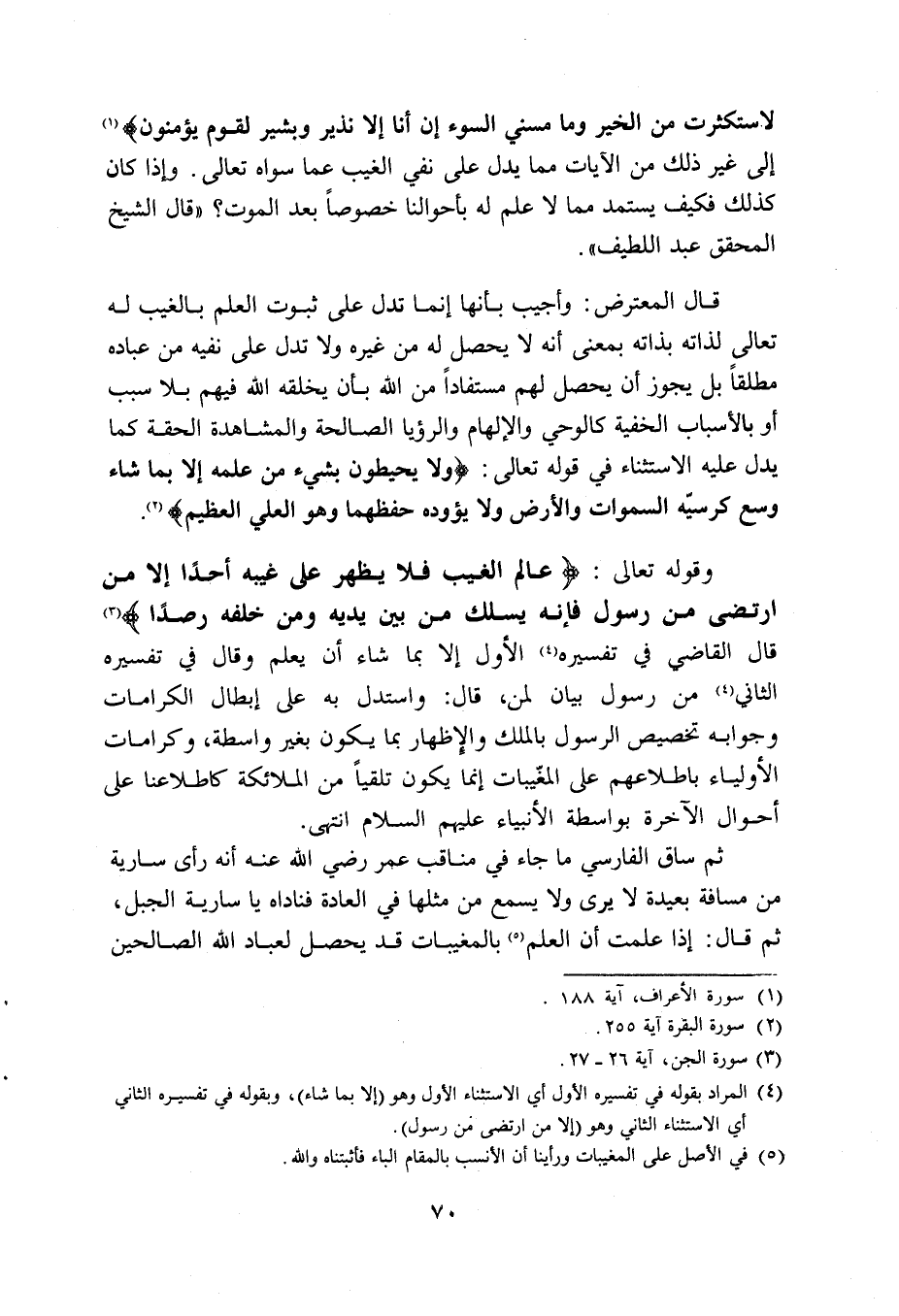 لَاسْتَكْثَرْتُ مِنَ الْخَيْرِ وَمَا مَسَّنِيَ السُّوءُ إِنْ أَنَا إِلَّا نَذِيرٌ وَبَشِيرٌ لِقَوْمٍ يُؤْمِنُونَ} (1) ، إلى غير ذلك من الآيات مما يدل على نفي الغيب عما سواه تعالى. وإذا كان كذلك فكيف يستمد مما لا علم له بأحوالنا خصوصا بعد الموت؟ " قال الشيخ المحقق عبد اللطيف ".