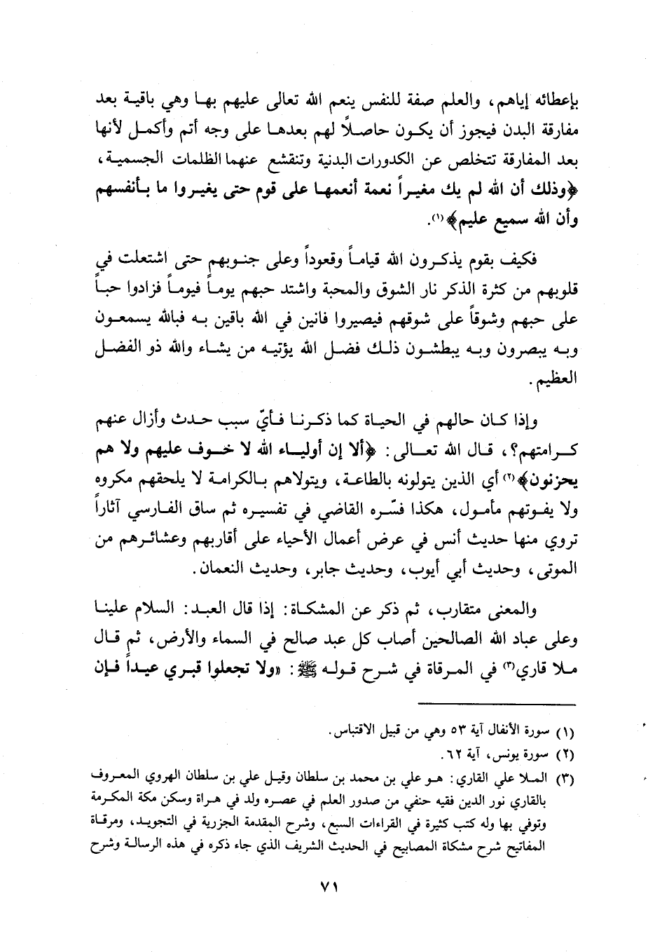 وإذا كان حالهم في الحياة كما ذكرنا فأي سبب حدث وأزال عنهم كراماتهم؟، قال الله تعالى: {أَلا إِنَّ أَوْلِيَاءَ اللَّهِ لا خَوْفٌ عَلَيْهِمْ وَلا هُمْ يَحْزَنُونَ} (2) أي الذين يتولونه بالطاعة، ويتولاهم بالكرامة لا يلحقهم مكروه ولا يفوتهم مأمول، هكذا فسره القاضي في تفسيره ثم ساق الفارسي آثارا تروى منها حديث أنس في عرض أعمال الأحياء على أقاربهم وعشائرهم من الموتى، وحديث أبي أيوب، وحديث جابر، وحديث النعمان.