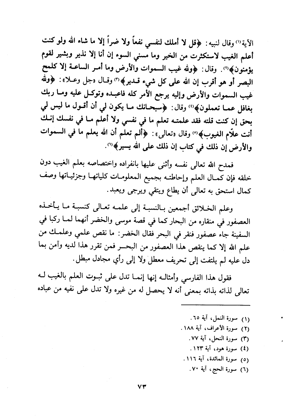 وقال لنبيه: {قُلْ لا أَمْلِكُ لِنَفْسِي نَفْعاً وَلا ضَرّاً إِلَّا مَا شَاءَ اللَّهُ وَلَوْ كُنْتُ أَعْلَمُ الْغَيْبَ لَاسْتَكْثَرْتُ مِنَ الْخَيْرِ وَمَا مَسَّنِيَ السُّوءُ إِنْ أَنَا إِلَّا نَذِيرٌ وَبَشِيرٌ لِقَوْمٍ يُؤْمِنُونَ} (1) ، وقال: {وَلِلَّهِ غَيْبُ السَّمَاوَاتِ وَالْأَرْضِ وَمَا أَمْرُ السَّاعَةِ إِلَّا كَلَمْحِ الْبَصَرِ أَوْ هُوَ أَقْرَبُ إِنَّ اللَّهَ عَلَى كُلِّ شَيْءٍ قَدِيرٌ} (2) ، وقال جل وعلا: {وَلِلَّهِ غَيْبُ السَّمَاوَاتِ وَالْأَرْضِ وَإِلَيْهِ يُرْجَعُ الْأَمْرُ كُلُّهُ فَاعْبُدْهُ وَتَوَكَّلْ عَلَيْهِ وَمَا رَبُّكَ بِغَافِلٍ عَمَّا تَعْمَلُونَ} (3) ، وقال: {سُبْحَانَكَ مَا يَكُونُ لِي أَنْ أَقُولَ مَا لَيْسَ لِي بِحَقٍّ إِنْ كُنْتُ قُلْتُهُ فَقَدْ عَلِمْتَهُ تَعْلَمُ مَا فِي نَفْسِي وَلا أَعْلَمُ مَا فِي نَفْسِكَ إِنَّكَ أَنْتَ عَلَّامُ الْغُيُوبِ} (4) ، وقال تعالى: {أَلَمْ تَعْلَمْ أَنَّ اللَّهَ يَعْلَمُ مَا فِي السَّمَاءِ وَالْأَرْضِ إِنَّ ذَلِكَ فِي كِتَابٍ إِنَّ ذَلِكَ عَلَى اللَّهِ يَسِيرٌ} (5) .