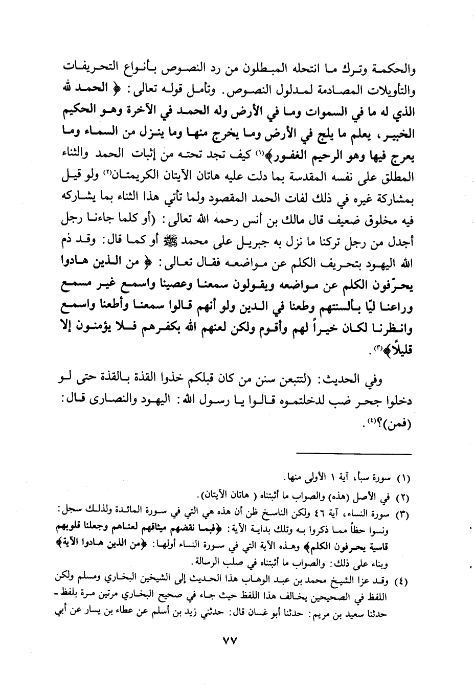 والحكمة وترك من انتحله المبطلون من رد النصوص بأنواع التحريفات والتأويلات المصادمة لمدلول النصوص، وتأمل قوله تعالى: {الْحَمْدُ لِلَّهِ الَّذِي لَهُ مَا فِي السَّمَاوَاتِ وَمَا فِي الْأَرْضِ وَلَهُ الْحَمْدُ فِي الْآخِرَةِ وَهُوَ الْحَكِيمُ الْخَبِيرُ يَعْلَمُ مَا يَلِجُ فِي الْأَرْضِ وَمَا يَخْرُجُ مِنْهَا وَمَا يَنْزِلُ مِنَ السَّمَاءِ وَمَا يَعْرُجُ فِيهَا وَهُوَ الرَّحِيمُ الْغَفُورُ} (1) ، كيف تجد تحته من إثبات الحمد والثناء المطلق على نفسه المقدسة بما دلت عليه هاتان الآيتان الكريمتان (2) ، ولو قيل بمشاركة غيره في ذلك لفات الحمد المقصود ولما تأتى هذا الثناء بما يشاركه فيه مخلوق ضعيف قال مالك بن أنس رحمه الله تعالى: (أو كلما جاءنا رجل أجدل من رجل تركنا ما نزل به جبريل على محمد صلى الله عليه وسلم أو كما قال: وقد ذم الله اليهود بتحريف الكلم عن مواضعه فقال تعالى: {مِنَ الَّذِينَ هَادُوا يُحَرِّفُونَ الْكَلِمَ عَنْ مَوَاضِعِهِ وَيَقُولُونَ سَمِعْنَا وَعَصَيْنَا وَاسْمَعْ غَيْرَ مُسْمَعٍ وَرَاعِنَا لَيّاً بِأَلْسِنَتِهِمْ وَطَعْناً فِي الدِّينِ وَلَوْ أَنَّهُمْ قَالُوا سَمِعْنَا وَأَطَعْنَا وَاسْمَعْ وَانْظُرْنَا لَكَانَ خَيْراً لَهُمْ وَأَقْوَمَ وَلَكِنْ لَعَنَهُمُ اللَّهُ بِكُفْرِهِمْ فَلا يُؤْمِنُونَ إِلَّا قَلِيلاً} (3) .