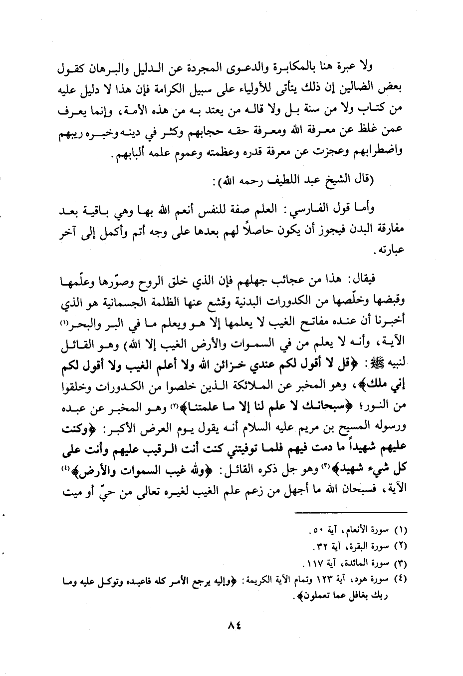 (قال الشيخ عبد اللطيف رحمه الله) : وأما قول الفارسي: العلم صفة للنفس أنعم الله بها وهي باقية بعد مفارقة البدن فيجوز أن يكون حاصلا لهم بعدها على وجه أتم وأكمل إلى آخر عباراته.