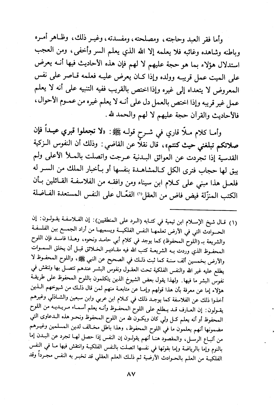 وأما كلام الملا قاري في شرح قوله صلى الله عليه وسلم: "لا تجعلوا قبري عيدا فإن صلاتكم تبلغني حيث كنتم"، قال نقلا عن القاضي: وذلك أن النفوس الزكية القدسية إذا تجردت عن العوائق البدنية عرجت واتصلت بالملأ الأعلى ولم يبق لها حجاب فترى الكل كالمشاهد بنفسها أو بإخبار الملك من السر له فلعل هذا مبني على كلام ابن سينا ومن وافقه من الفلاسفة القائلين بأن الكتب المنزلة فيض فاض من العقل (1) الفعال على النفس المستعدة الفاضلة