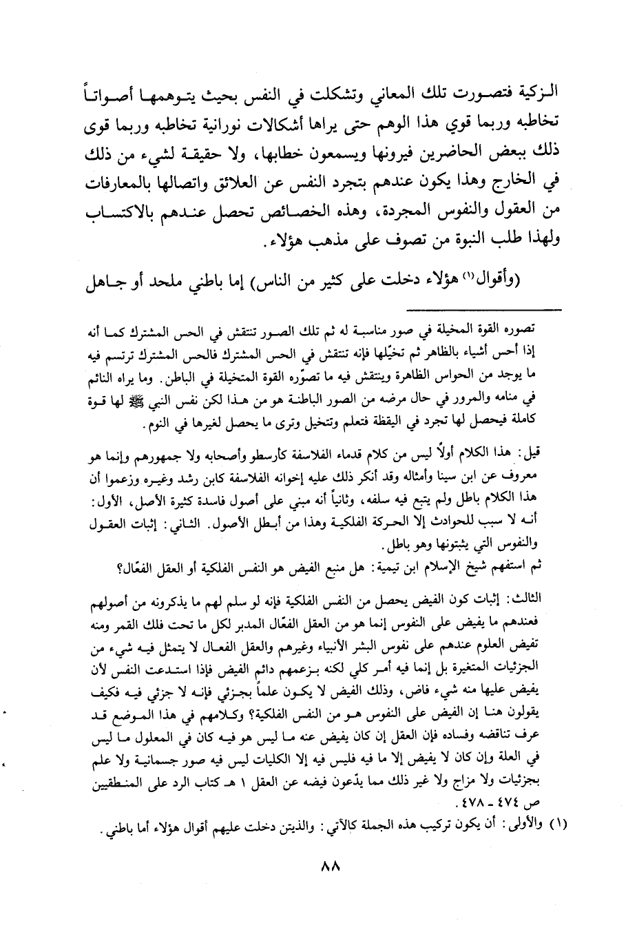 الزكية فتصورت تلك المعاني وتشكلت في النفس بحيث يتوهمها أصواتا تخاطبه وربما قوي هذا الوهم حتى يراها أشكالات نورانية تخاطبه وربما قوي ذلك ببعض الحاضرين فيرونها ويسمعون خطابها، ولا حقيقة لشيء من ذلك في الخارج وهذا يكون عندهم بتجرد النفس عن العلائق واتصالها بالمعارفات من العقول والنفوس المجردة، وهذه الخصائص تحصل عندهم بالاكتساب ولهذا طلب النبوة من تصوف على مذهب هؤلاء.