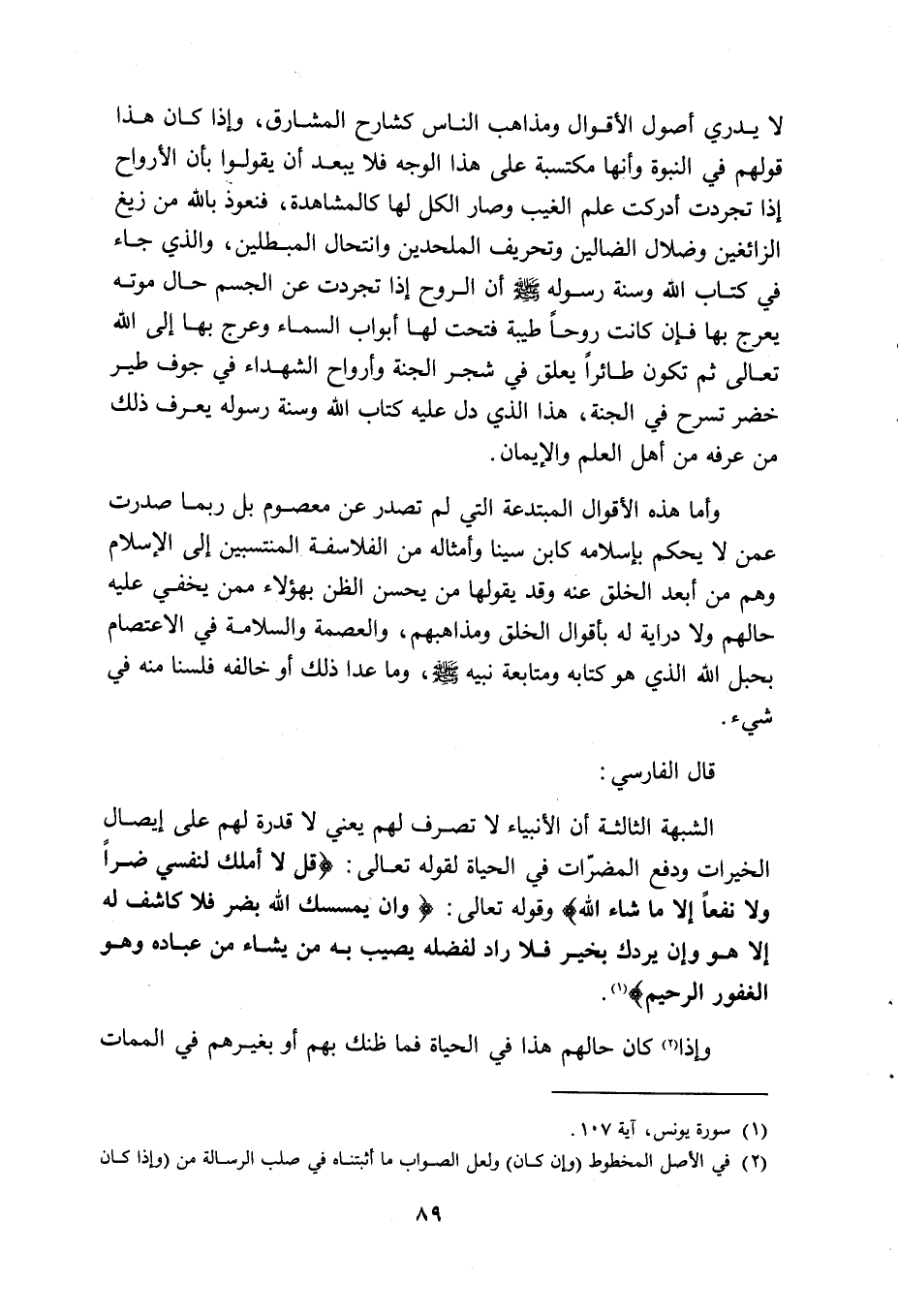 قال الفارسي: الشبهة الثالثة أن الأنبياء لا تصرف لهم يعني لا قدرة لهم على إيصال الخيرات ودفع المضرات في الحياة لقوله تعالى: {قُلْ لا أَمْلِكُ لِنَفْسِي نَفْعاً وَلا ضَرّاً إِلَّا مَا شَاءَ اللَّهُ} (1) ، {وَإِنْ يَمْسَسْكَ اللَّهُ بِضُرٍّ فَلا كَاشِفَ لَهُ إِلَّا هُوَ وَإِنْ يُرِدْكَ بِخَيْرٍ فَلا رَادَّ لِفَضْلِهِ يُصِيبُ بِهِ مَنْ يَشَاءُ مِنْ عِبَادِهِ وَهُوَ الْغَفُورُ الرَّحِيمُ} (2) .