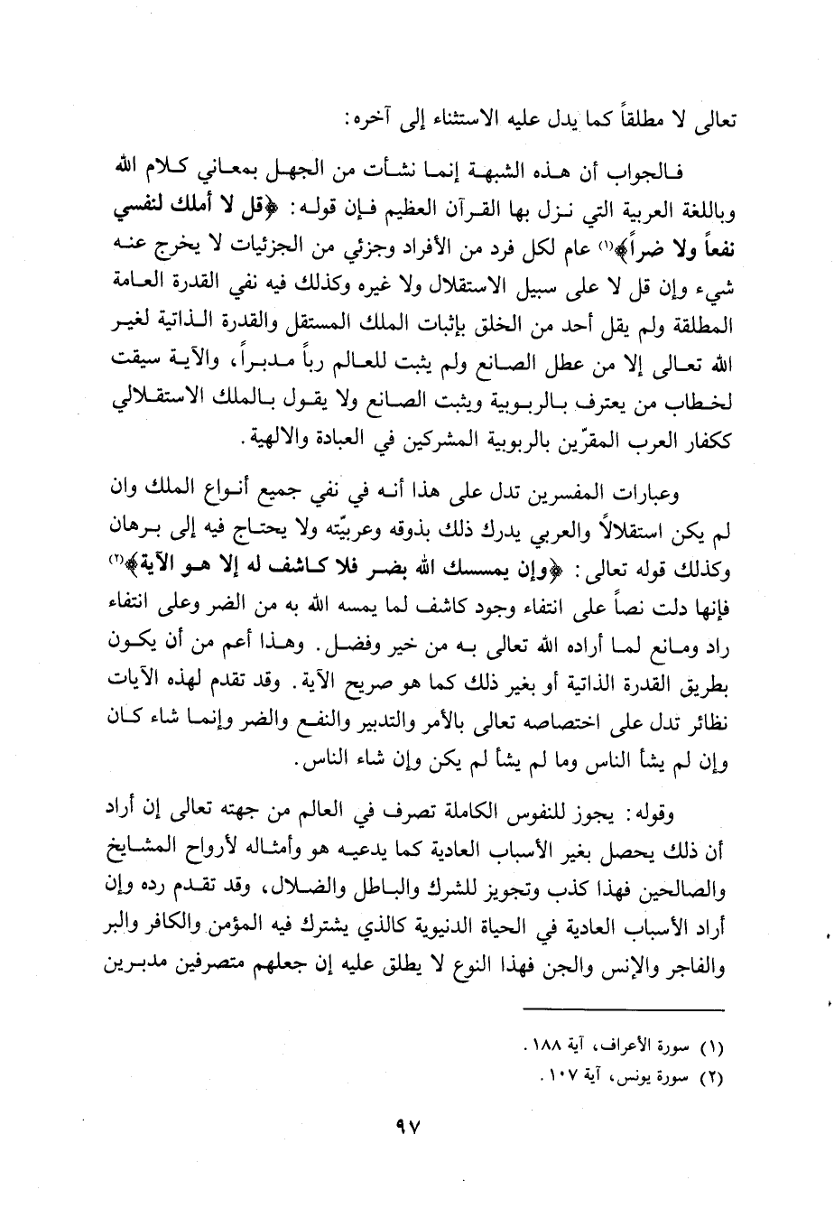 فالجواب أن هذه الشبهة إنما نشأت من الجهل بمعاني كلام الله وباللغة العربية التي نزل بها القرآن العظيم فإن قوله: {قُلْ لا أَمْلِكُ لِنَفْسِي نَفْعاً وَلا ضَرّاً} (1) عام لكل فرد من الأفراد وجزئي من الجزئيات لا يخرج عنه شيء وإن قل لا على سبيل الاستقلال ولا غيره وكذلك فيه نفي القدرة العامة المطلقة ولم يقل أحد من الخلق بإثبات الملك المستقل والقدرة الذاتية لغير الله تعالى إلى من عطل الصانع ولم يثبت للعالم ربا مدبرا، والآية سيقت لخطاب من يعترف بالربوبية ويثبت الصانع ولا يقول بالملك الاستقلالي ككفار العرب المقرين بالربوبية المشركين في العبادة والإلهية.