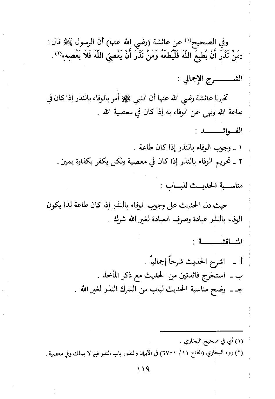 حيث دل الحديث على وجوب الوفاء بالنذر إذا كان طاعة؛ لذا يكون الوفاء بالنذر عبادة، وصرف العبادة لغير الله شرك.