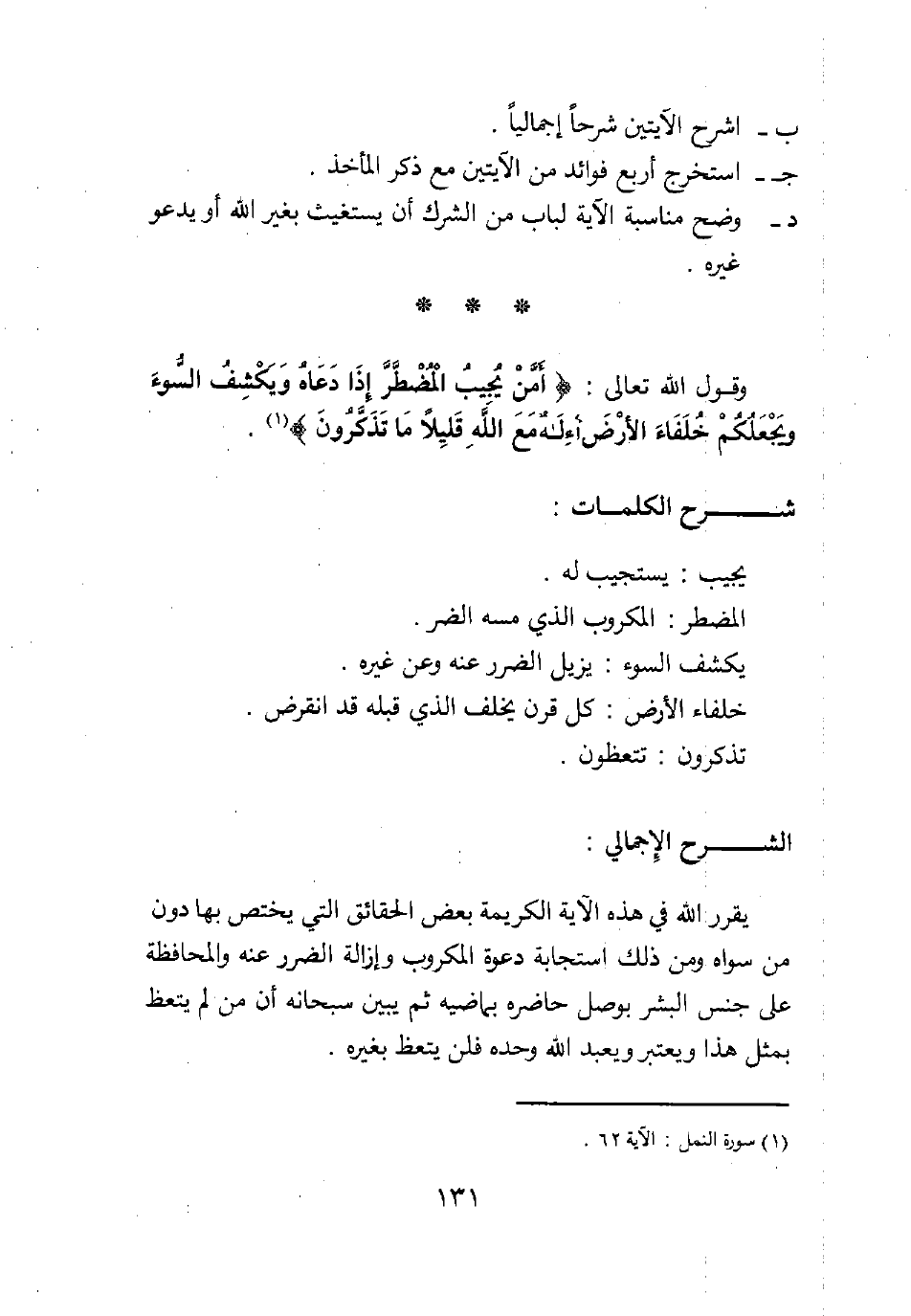 وقول الله تعالى: {أَمَّنْ يُجِيبُ الْمُضْطَرَّ إِذَا دَعَاهُ وَيَكْشِفُ السُّوءَ وَيَجْعَلُكُمْ خُلَفَاءَ الأَرْضِ أَإِلَهٌ مَعَ اللَّهِ قَلِيلاً مَا تَذَكَّرُونَ} 1. شرح الكلمات: