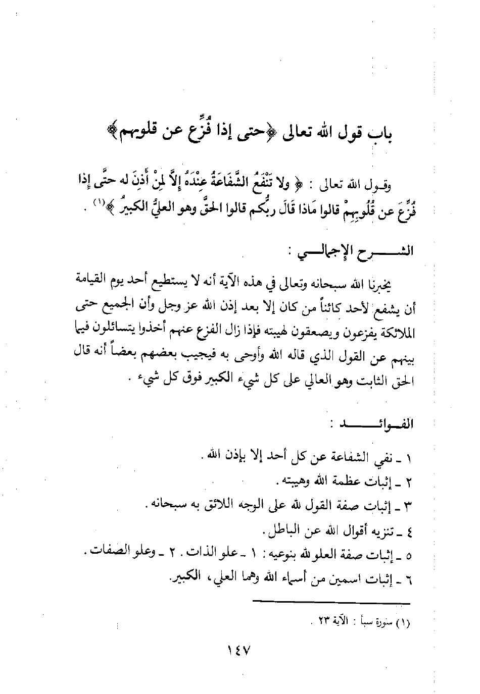 وقول الله تعالى: {وَلا تَنْفَعُ الشَّفَاعَةُ عِنْدَهُ إِلا لِمَنْ أَذِنَ لَهُ حَتَّى إِذَا فُزِّعَ عَنْ قُلُوبِهِمْ قَالُوا مَاذَا قَالَ رَبُّكُمْ قَالُوا الْحَقَّ وَهُوَ الْعَلِيُّ الْكَبِيرُ} 1.