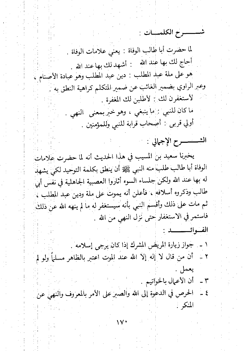 يخبرنا سعيد بن المسيب في هذا الحديث أنه لما حضرت علامات الوفاة أبا طالب، طلب منه النبي صلى الله عليه وسلم أن ينطق بكلمة التوحيد؛ لكي يشهد له بها عند الله، ولكن جلساء السوء أثاروا العصبية الجاهلية في نفس أبي طالب وذكروه أسلافه، فأعلن أنه يموت على ملة ودين عبد المطلب، ثم مات على ذلك، وأقسم النبي بأنه سيستغفر له ما لم ينهه الله عن ذلك، فاستمر في الاستغفار حتى نزل النهي من الله.