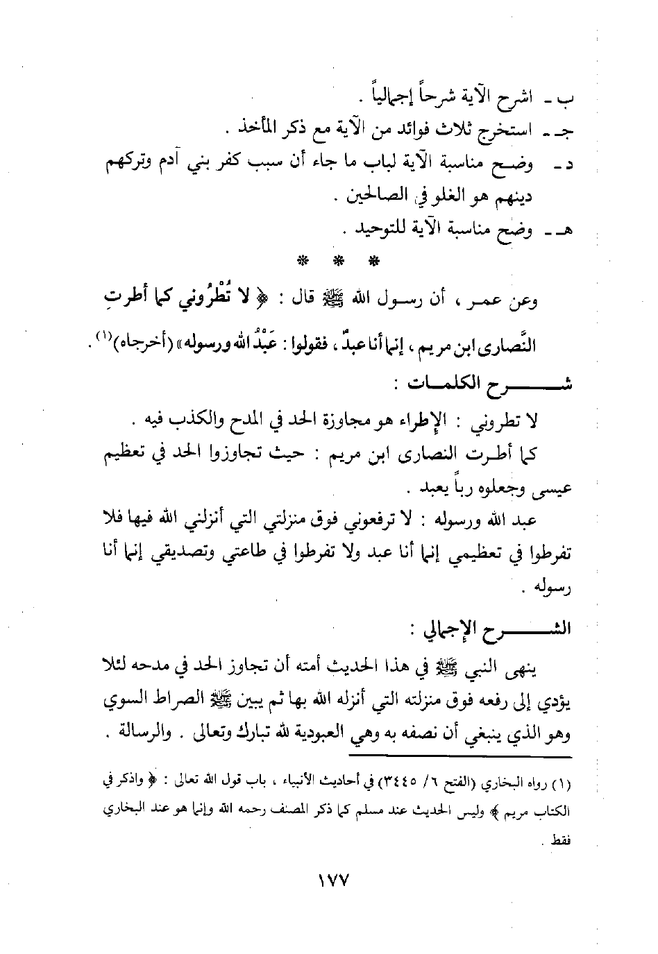 لا تطروني: الإطراء هو مجاوزة الحد في المدح والكذب فيه. كما أطرت النصارى ابن مريم: حيث تجاوزوا الحد في تعظيم عيسى وجعلوه ربا يعبد. عبد الله ورسوله: لا ترفعوني فوق منزلتي التي أنزلني الله فيها، فلا تفرطوا في تعظيمي إنما أنا عبد، ولا تفرطوا في طاعتي وتصديقي إنما أنا رسوله.